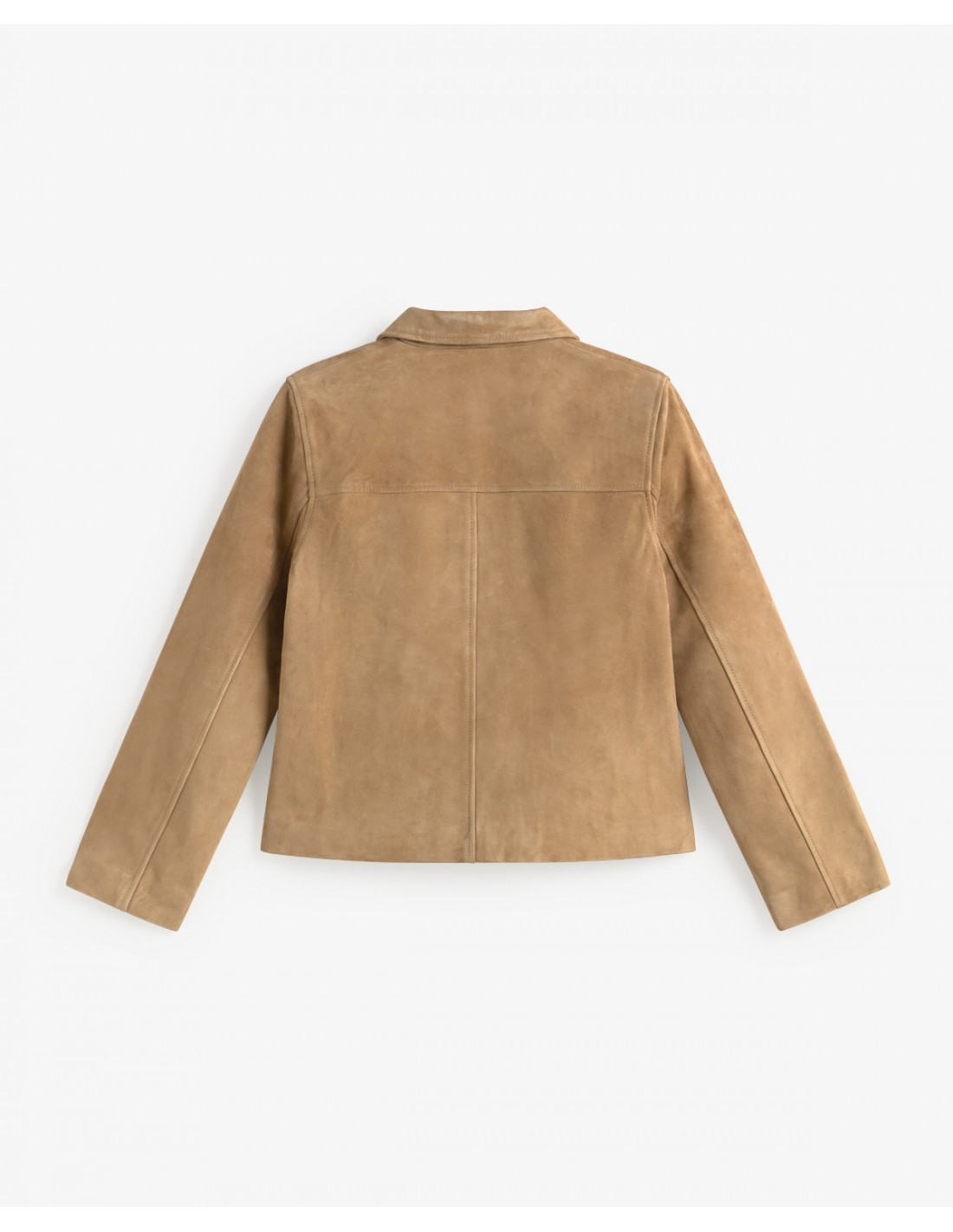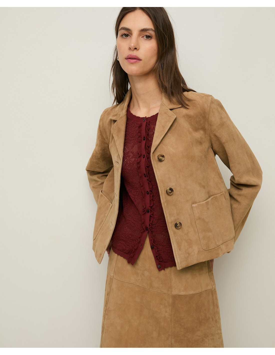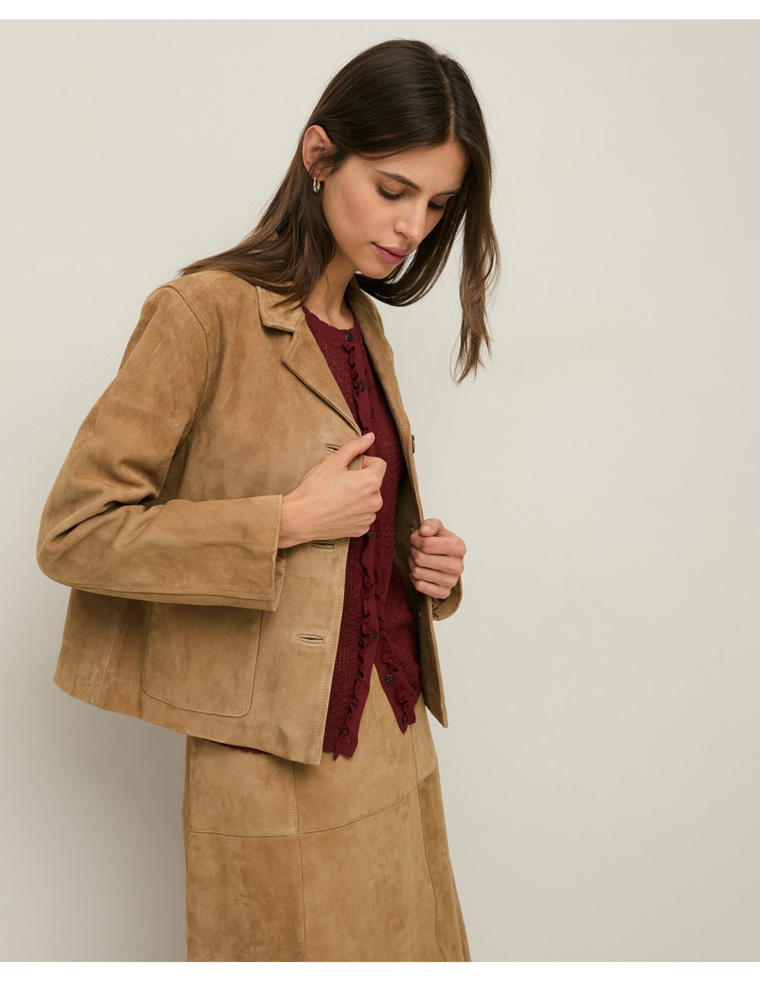 Chaqueta corta de ante de Yerse confeccionada en piel caprina de tacto suave y acabado aterciopelado.