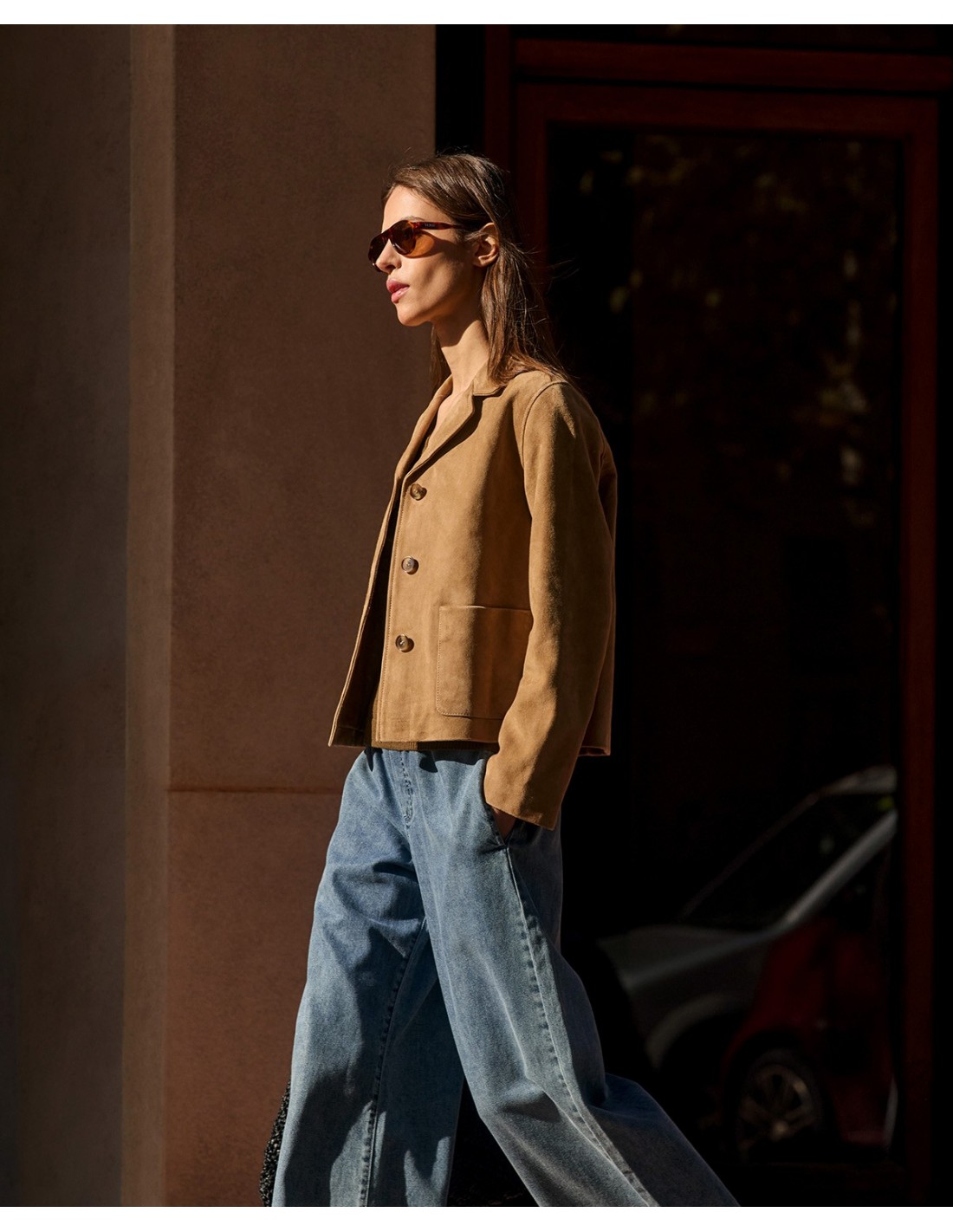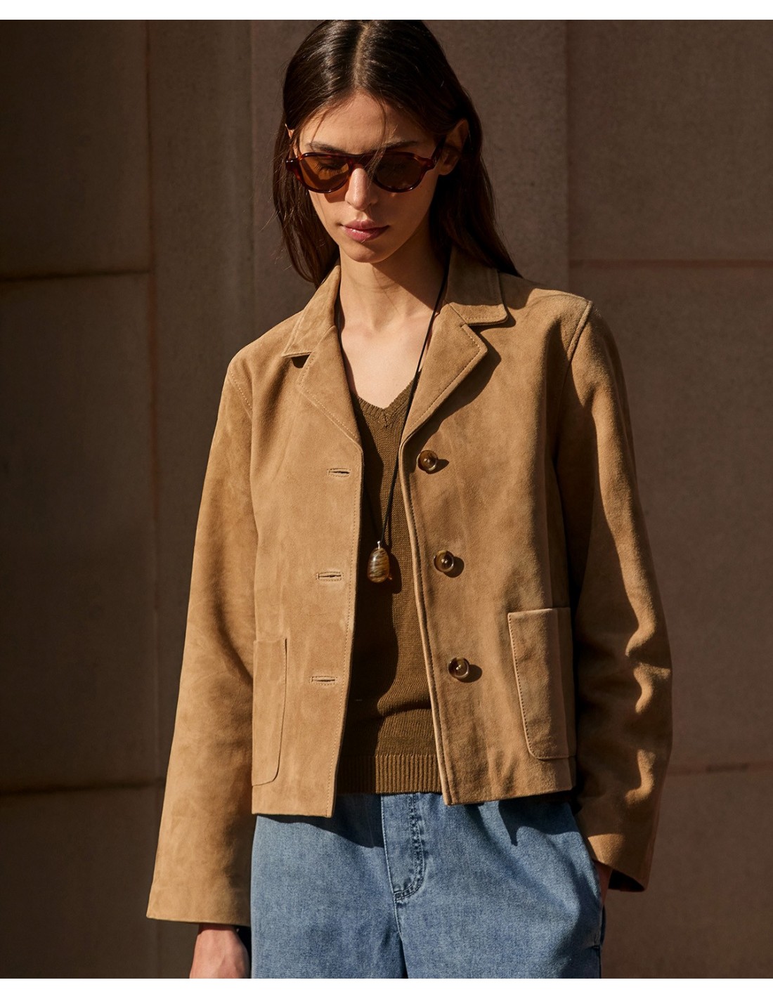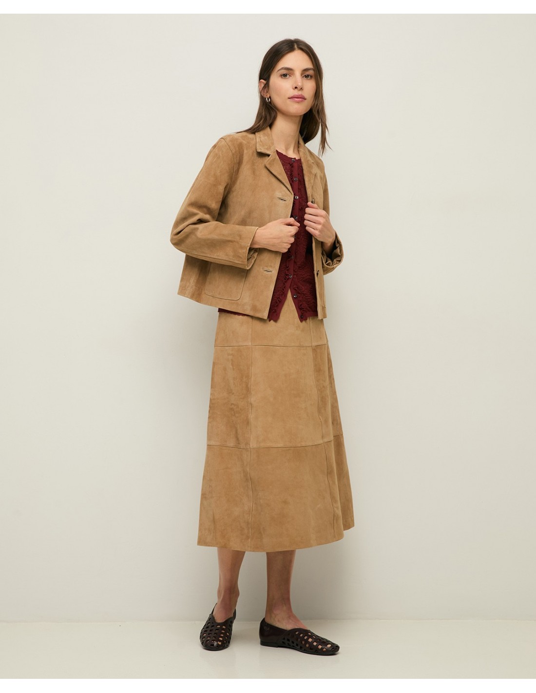 Chaqueta corta de ante de Yerse confeccionada en piel caprina de tacto suave y acabado aterciopelado.
