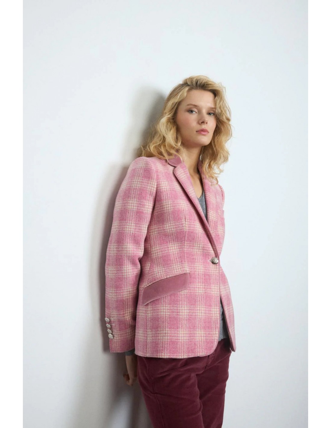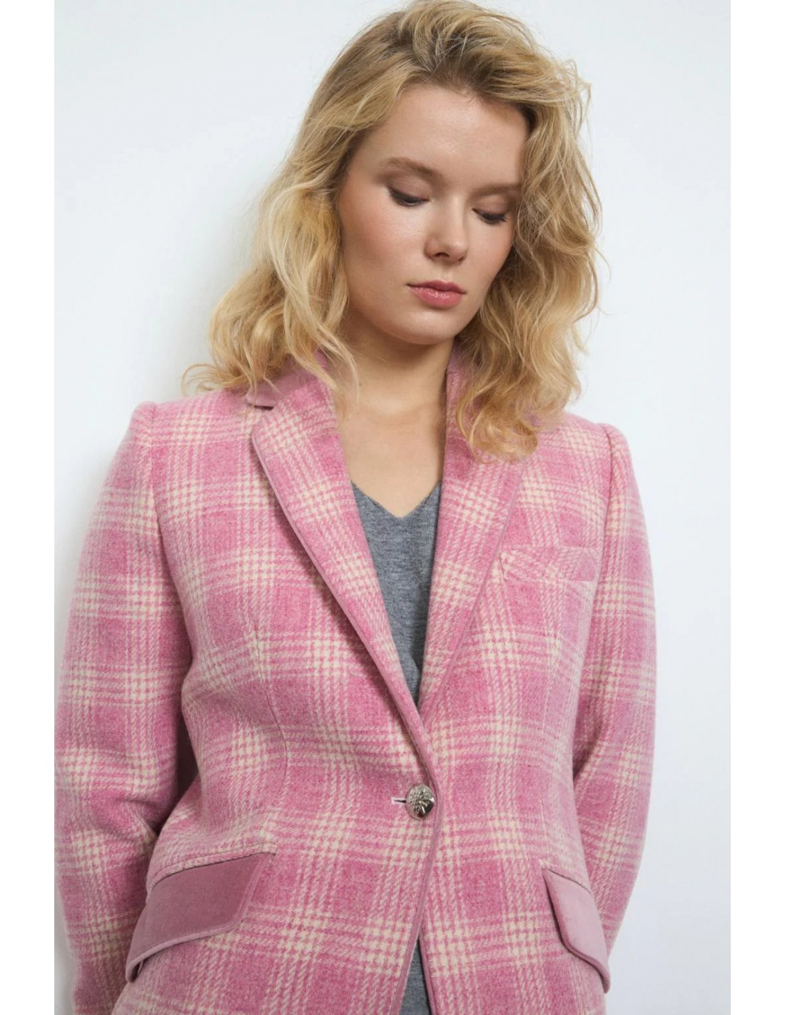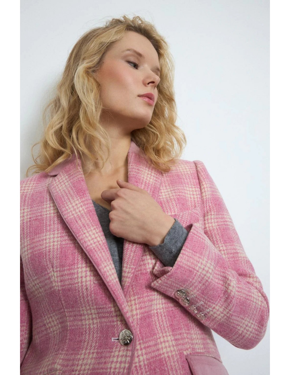 Americana entallada en lana 100% con estampado de cuadros en tonos rosa empolvado. Un diseño de inspiración romántica con bolsillos en terciopelo y botón metálico. La mezcla perfecta entre dulzura y estructura.