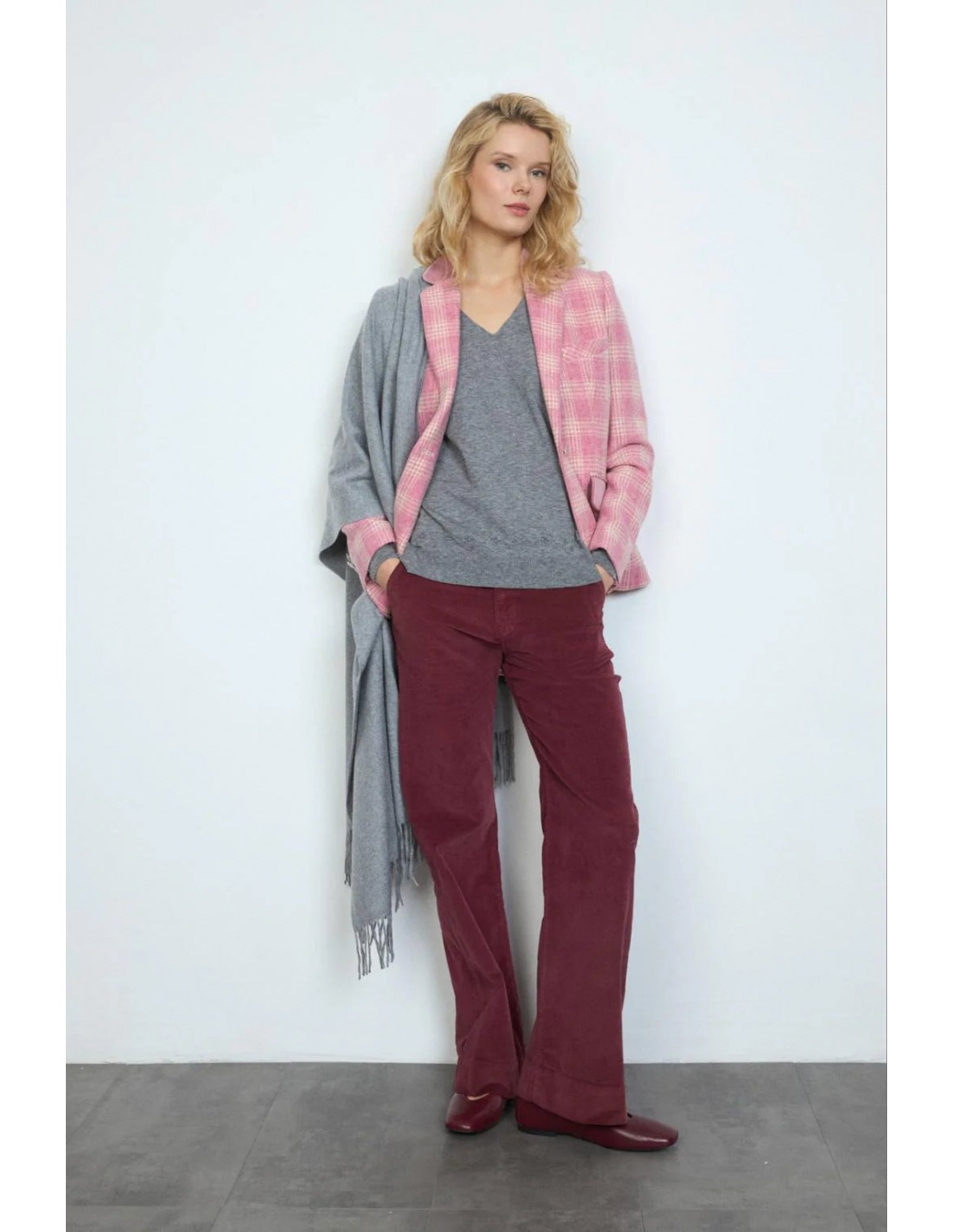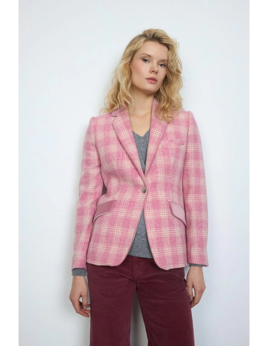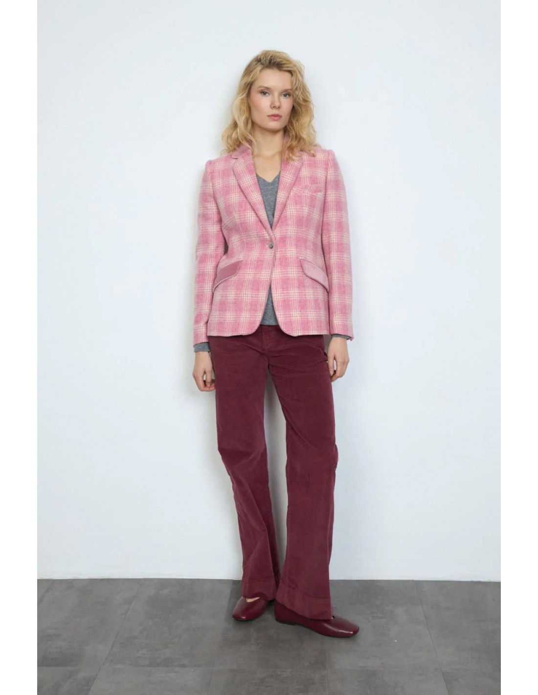 Americana entallada en lana 100% con estampado de cuadros en tonos rosa empolvado. Un diseño de inspiración romántica con bolsillos en terciopelo y botón metálico. La mezcla perfecta entre dulzura y estructura.
