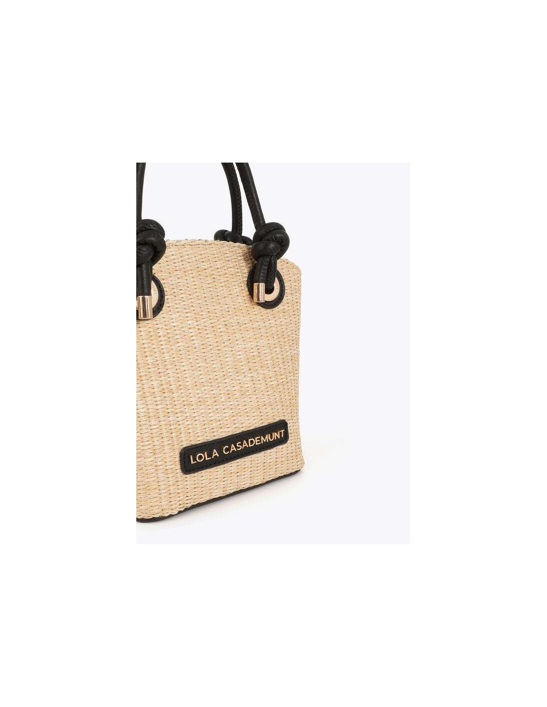 Bolsito pequeño efecto rafia en tono crudo con detalles en efecto piel negra, ideal para completar tus looks con un toque natural y sofisticado.