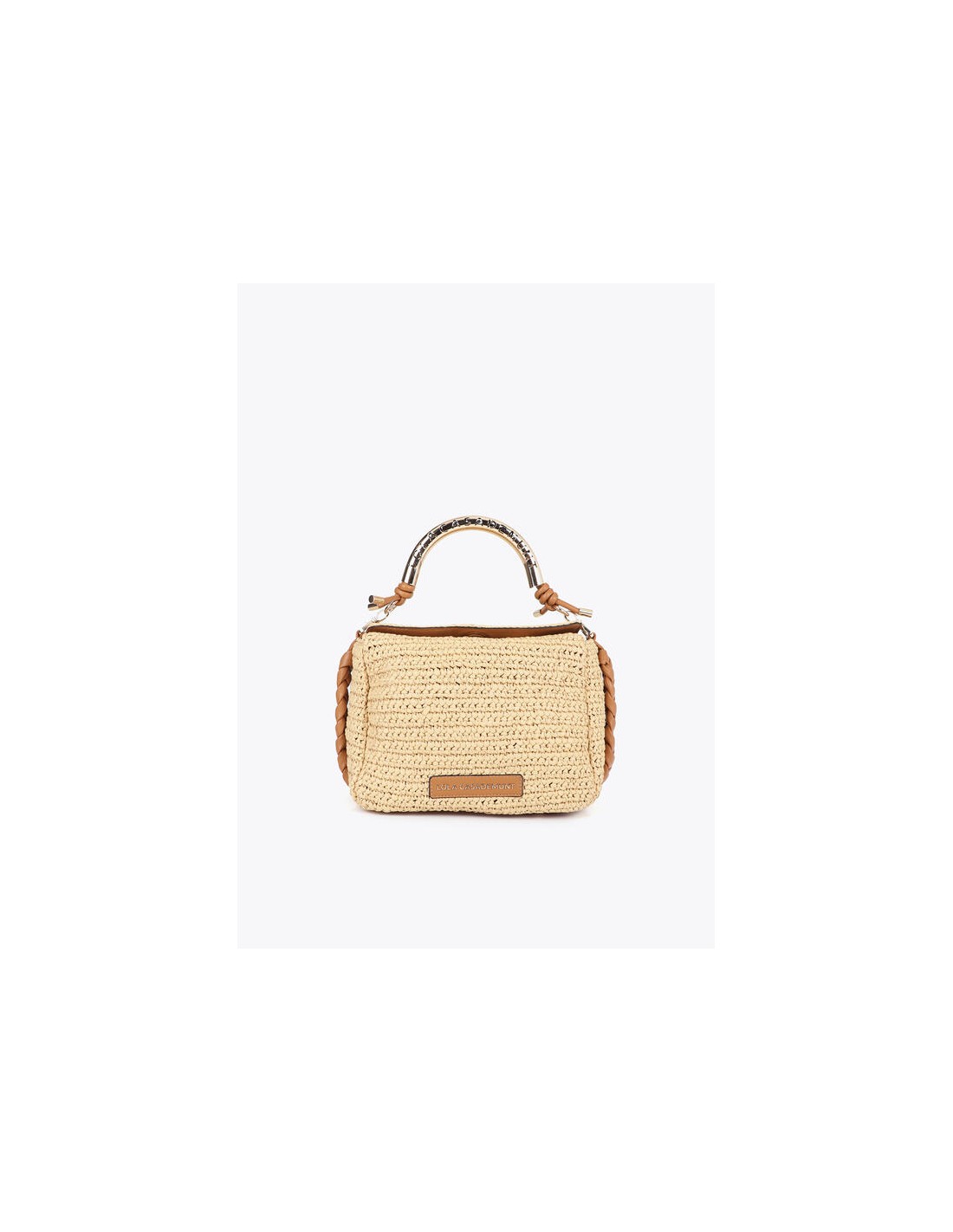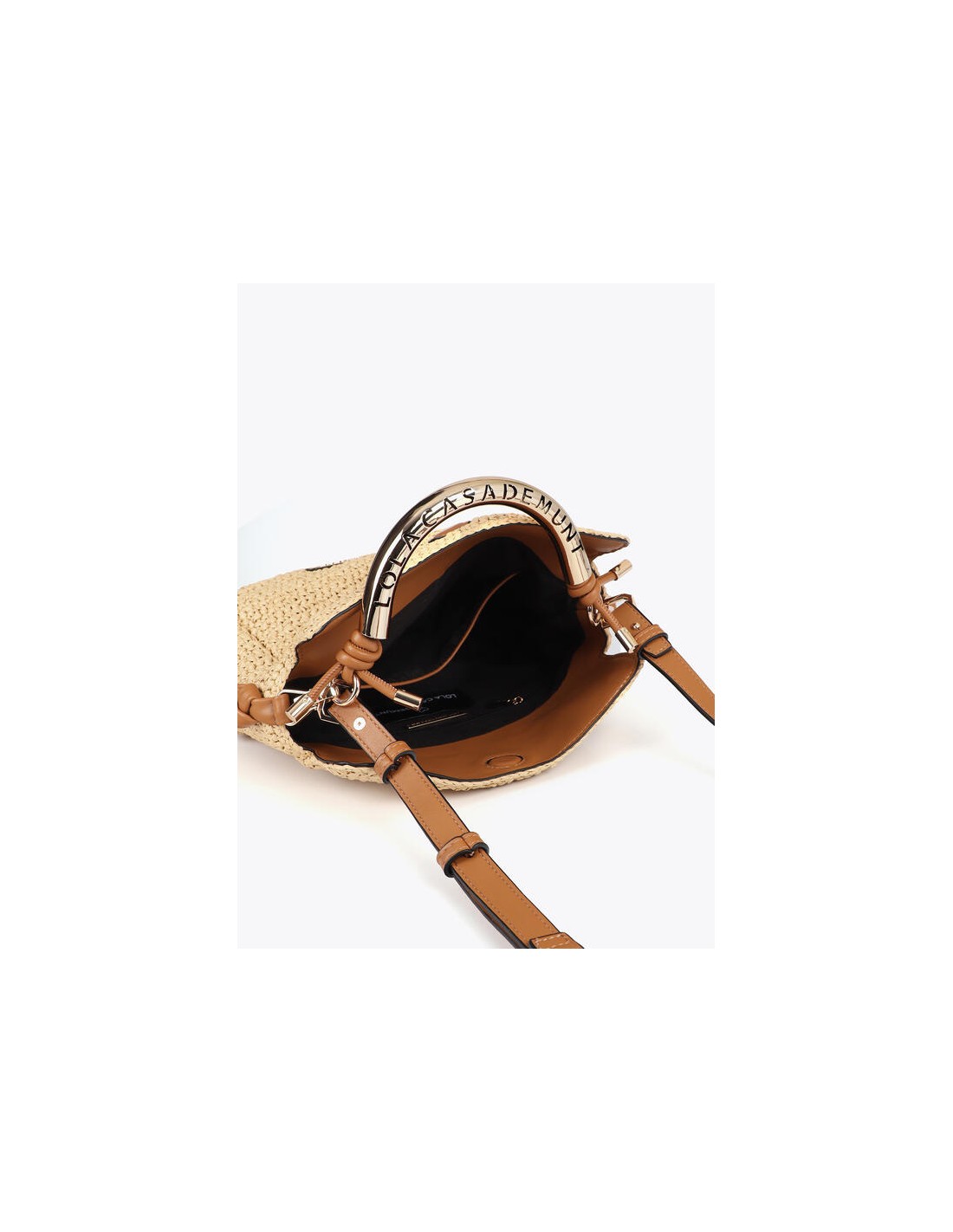 Bolso bandolera de la colección Lola Casademunt 1981 con inconfundible textura en efecto rafia y asa troquelada metálica con logo de la marca.