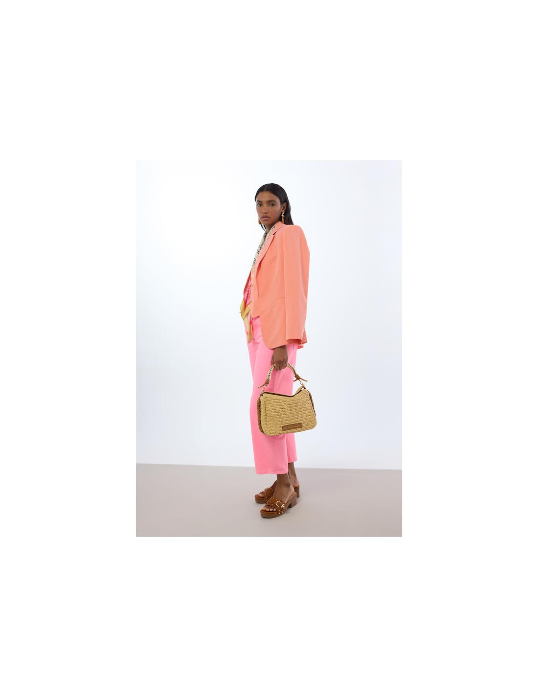 Bolso bandolera de la colección Lola Casademunt 1981 que combina la textura natural del efecto rafia con el brillo del asa troquelada metálica con logo. Un diseño estival cuidado hasta el último detalle, con cierre magnético seguro y correa ajustable de piel sintética trenzada que aporta un acabado artesanal muy reconocible.