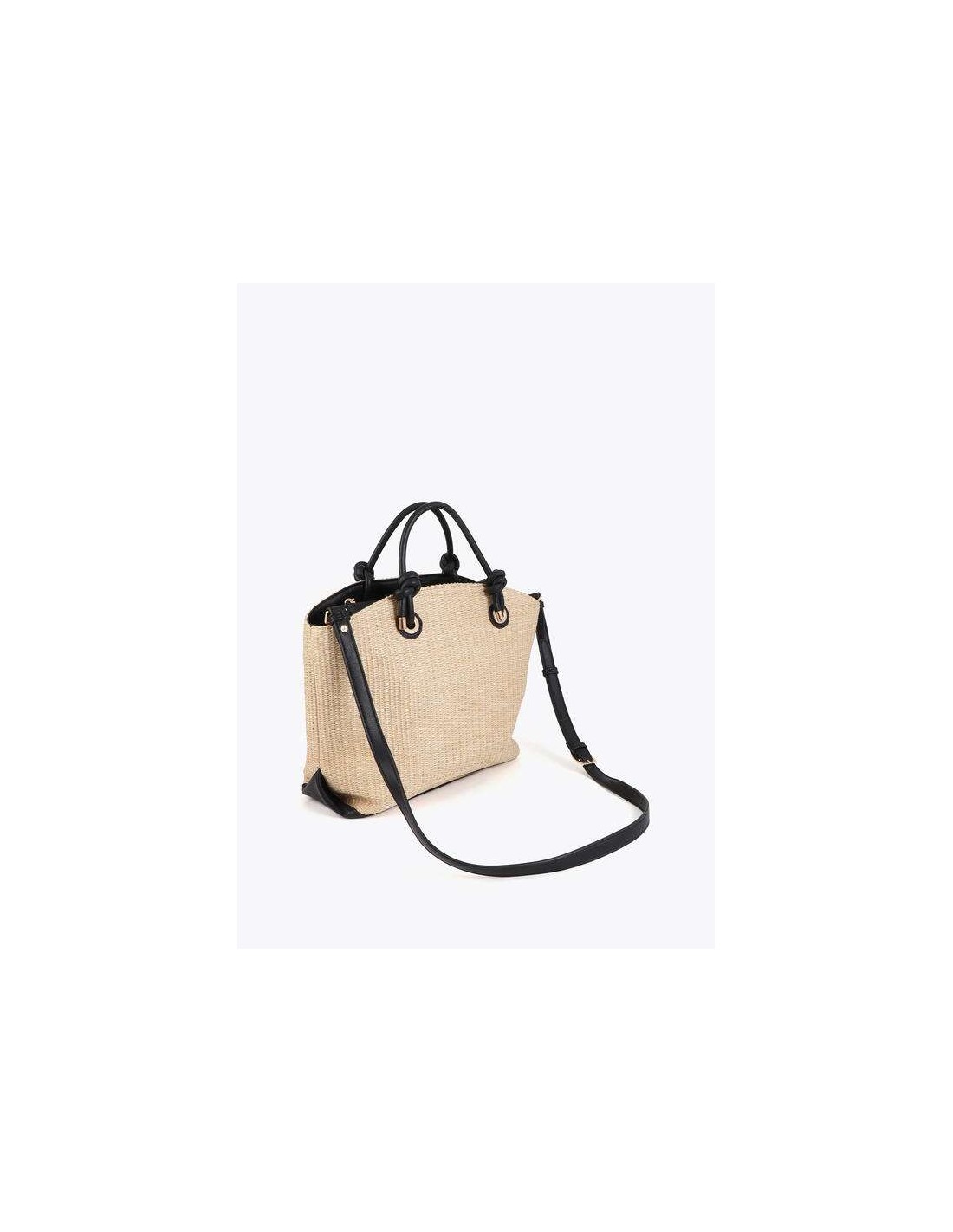 Bolso tipo capazo efecto rafia en tono crudo con detalles en negro, ideal para completar tus looks de temporada con un aire natural y sofisticado.