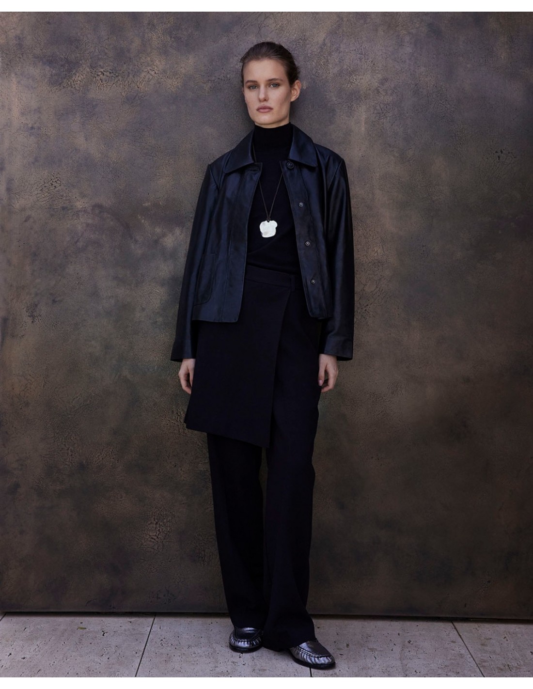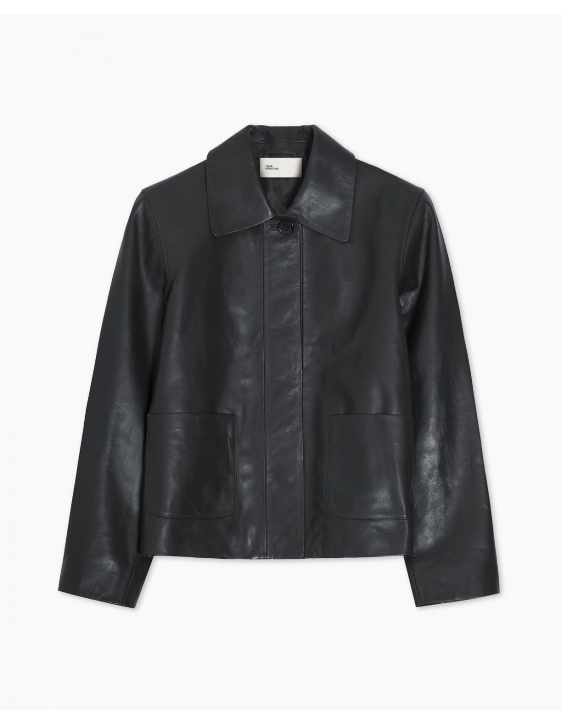 Chaqueta corta de 100% piel napa de YERSE, disponible en negro o burdeos. Corte regular, cuello camisero, bolsillos de plastrón y cierre con botones a presión. Atemporal, versátil y confeccionada con piel de alta calidad.