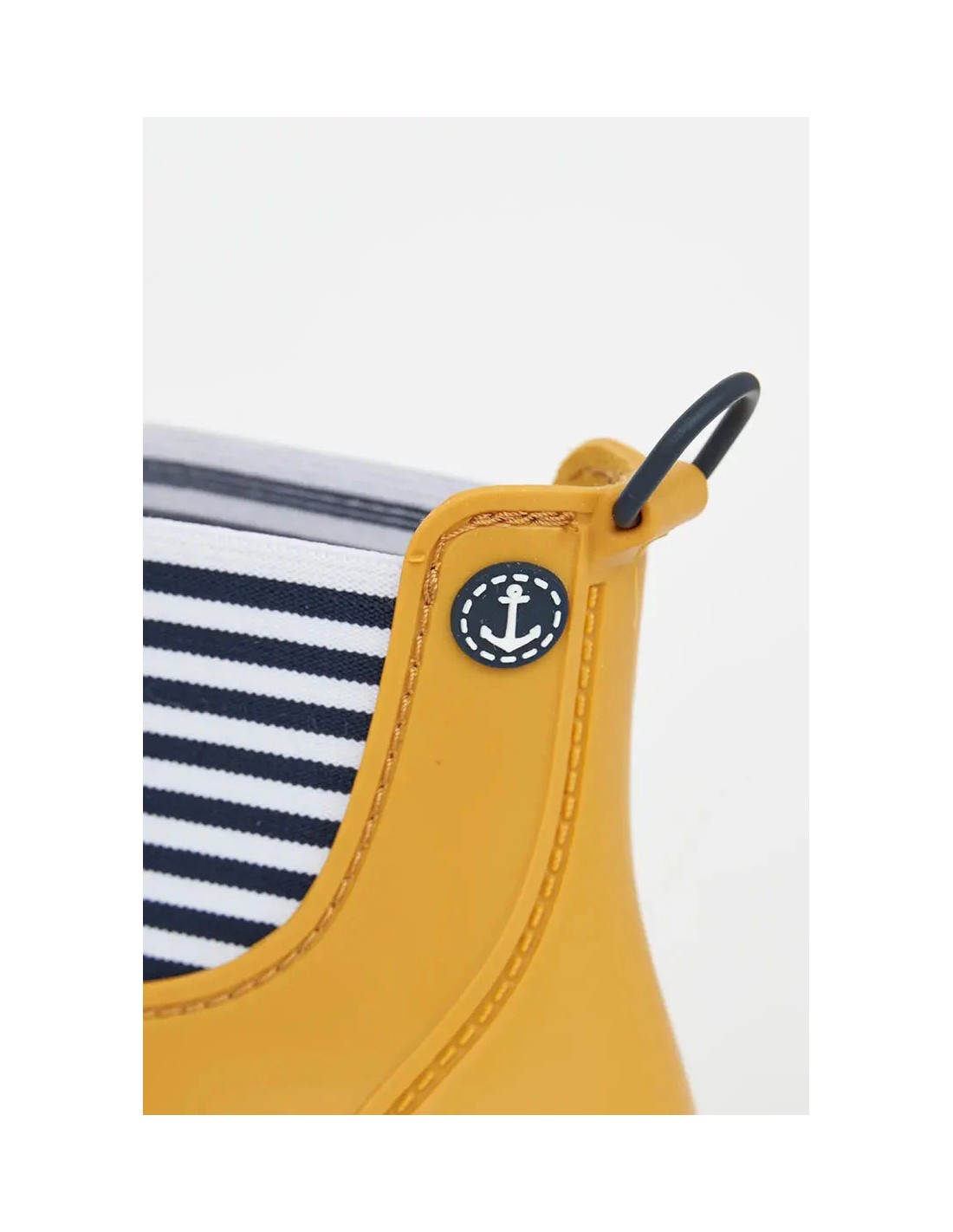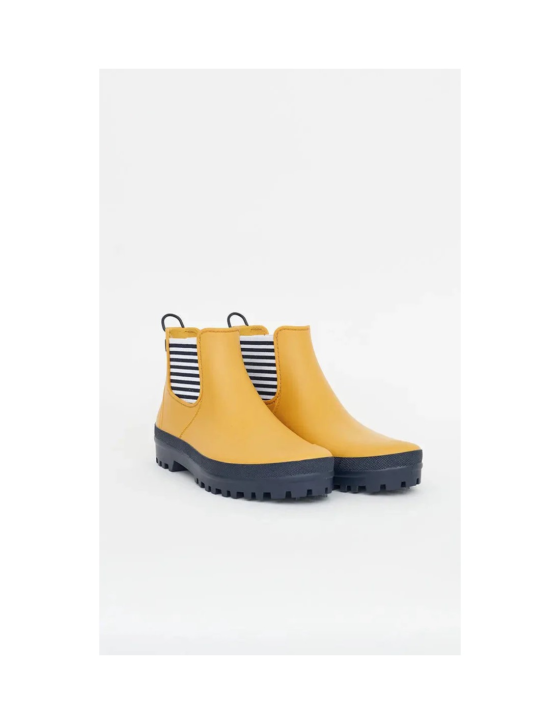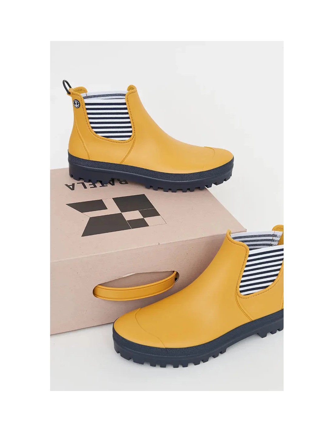 Botas impermeables de estilo Chelsea de Batela, disponibles en azul marino o amarillo. Diseño cómodo, funcional y con estética marinera, fabricado en España. Suela antideslizante, paneles elásticos laterales y forro interior a rayas. Perfectas para lluvia o días húmedos sin renunciar al estilo. Caña baja para máxima versatilidad.
