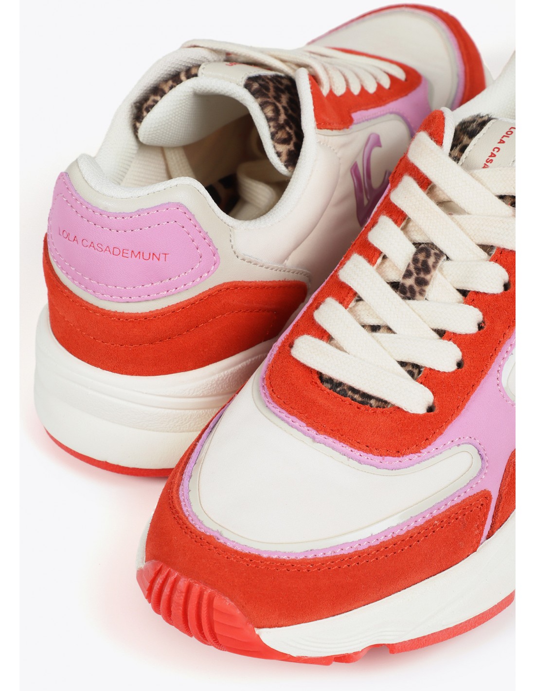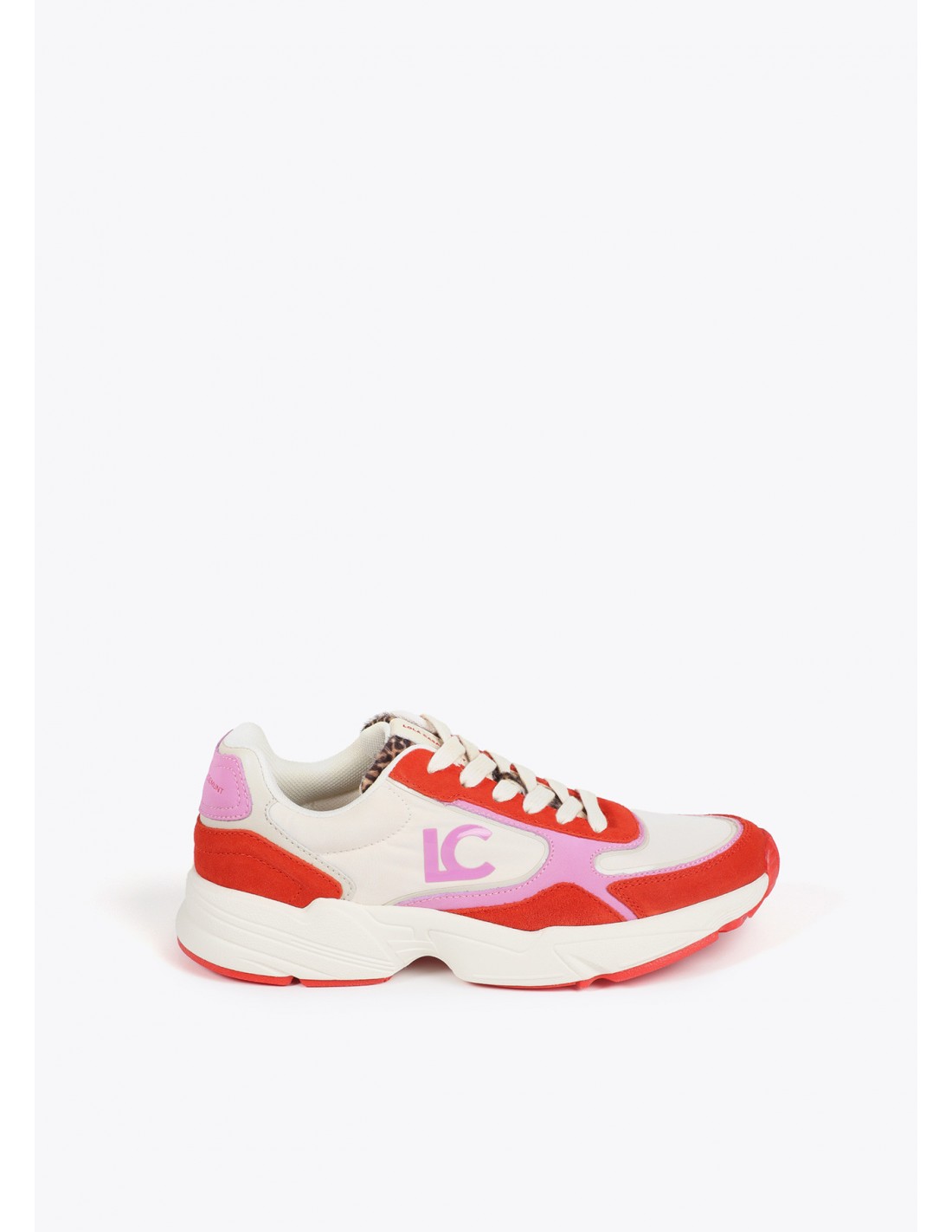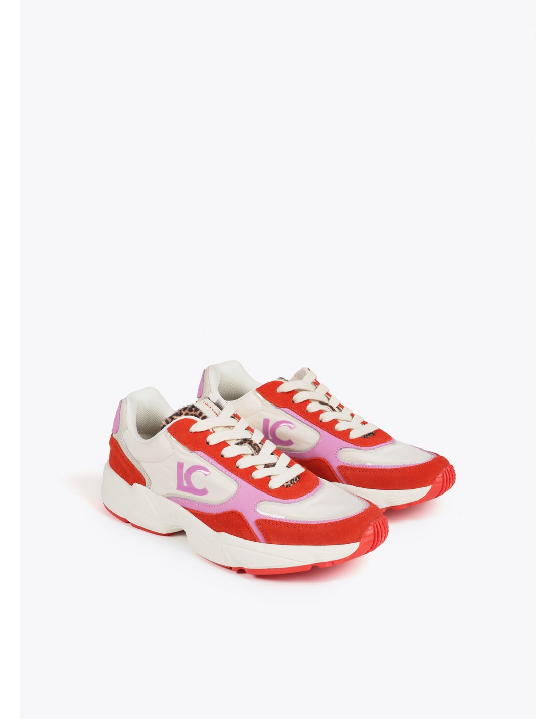 Las zapatillas deportivas de Lola Casademunt destacan por su estética única: una atrevida combinación de colores blanco, rojo y fucsia, con el inconfundible logo "LC" en el lateral. Su suela tipo running proporciona una pisada cómoda y segura, ideal para el día a día.