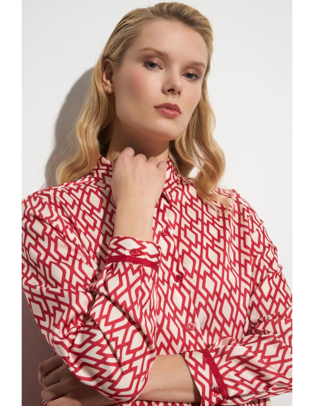 La Camisa Gades Rojo de Tinta y Bariloche es una prenda pensada para mujeres que aprecian la elegancia con un toque original. Su estampado geométrico en rojo vibrante destaca sobre el fondo crudo del tejido, generando un efecto visual atractivo y moderno.