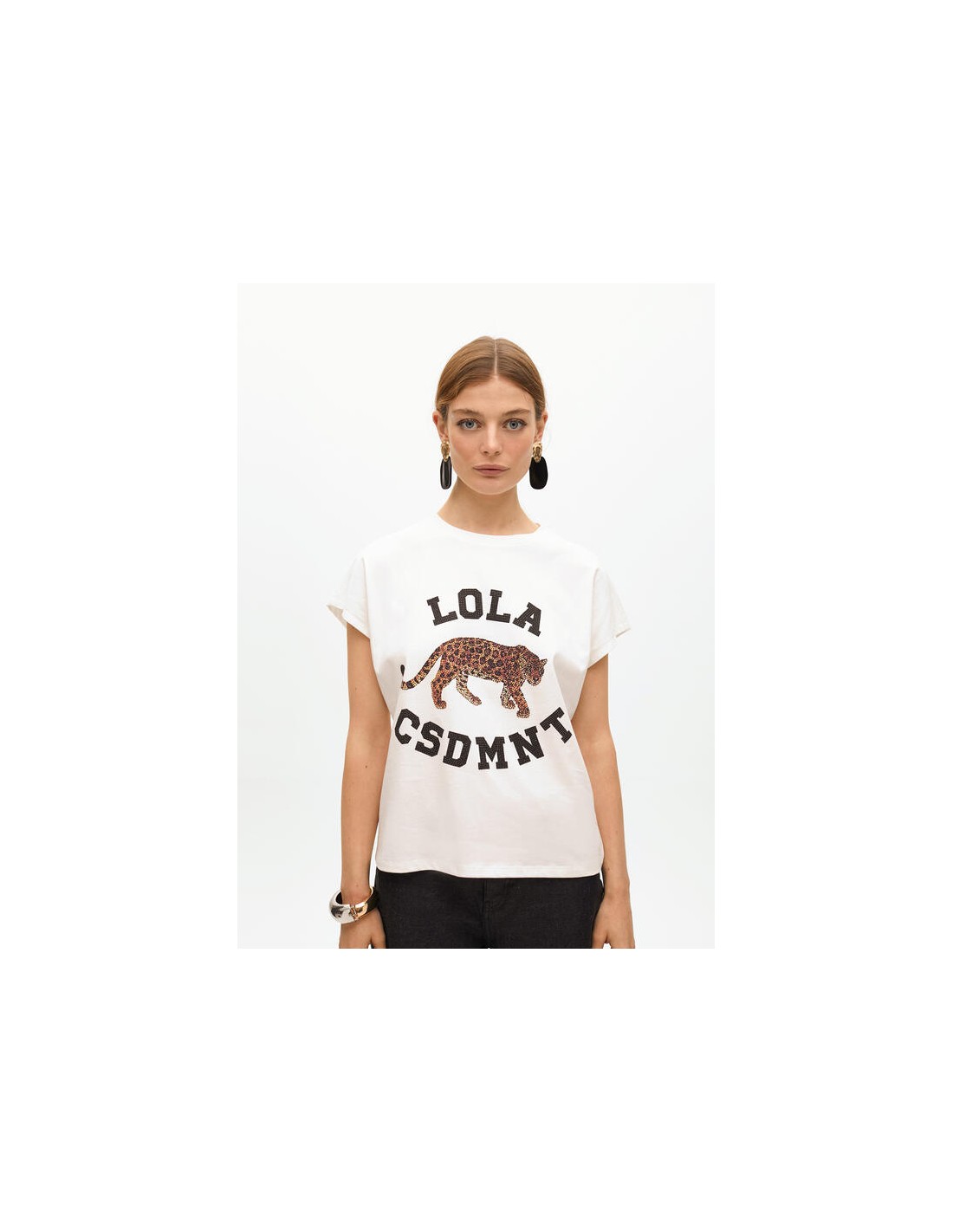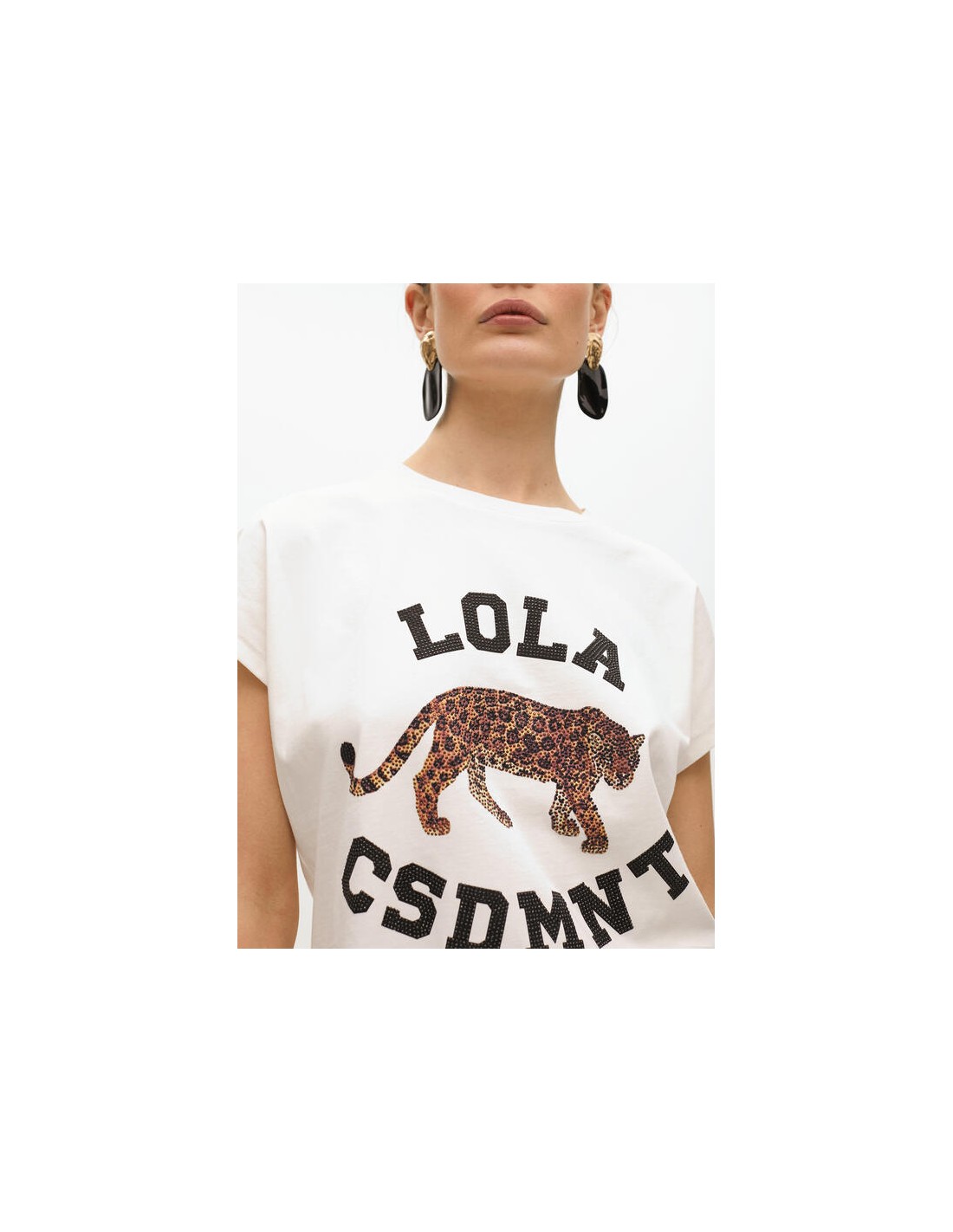 Camiseta blanca de algodón con estampado de tigre efecto pedrería y letras "LOLA CSDMNT". Una prenda versátil y con actitud que transforma cualquier look casual.