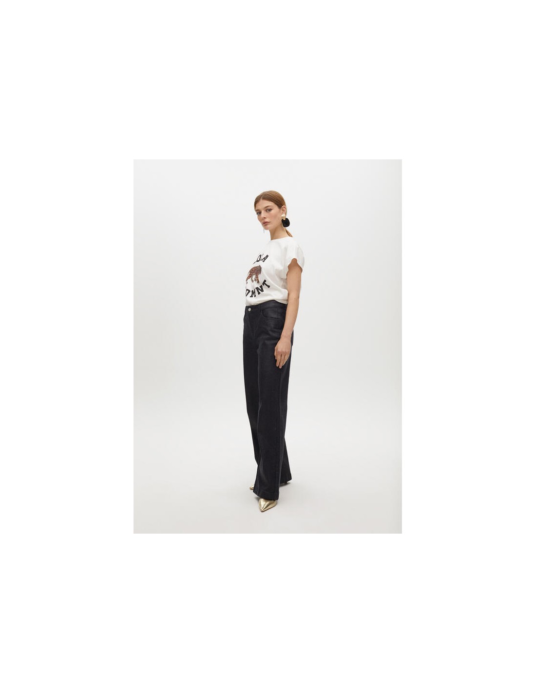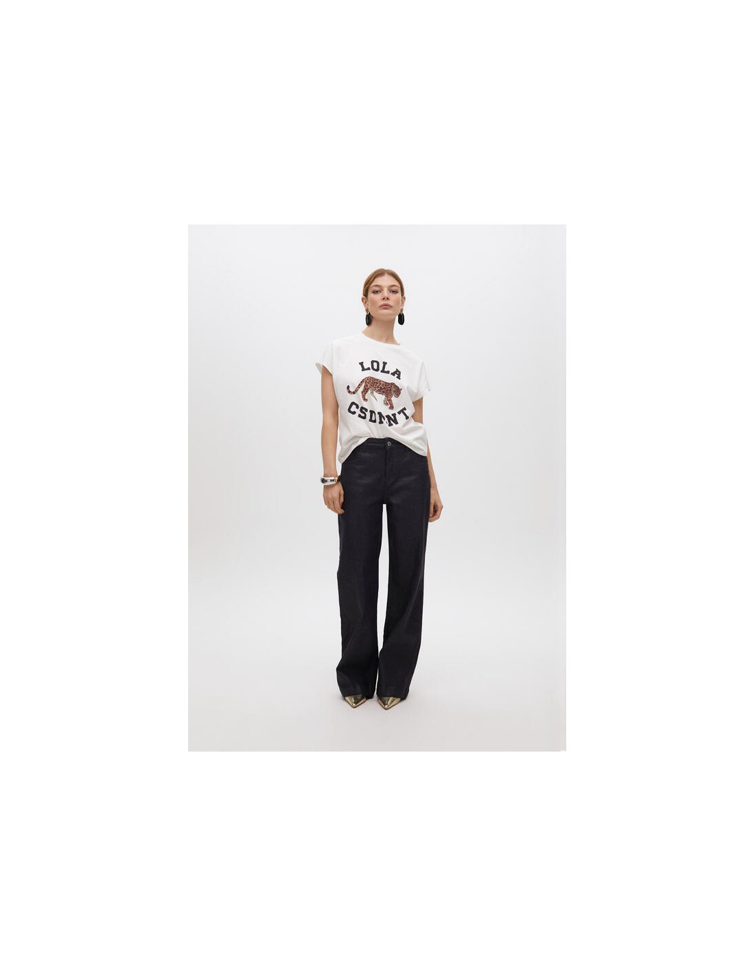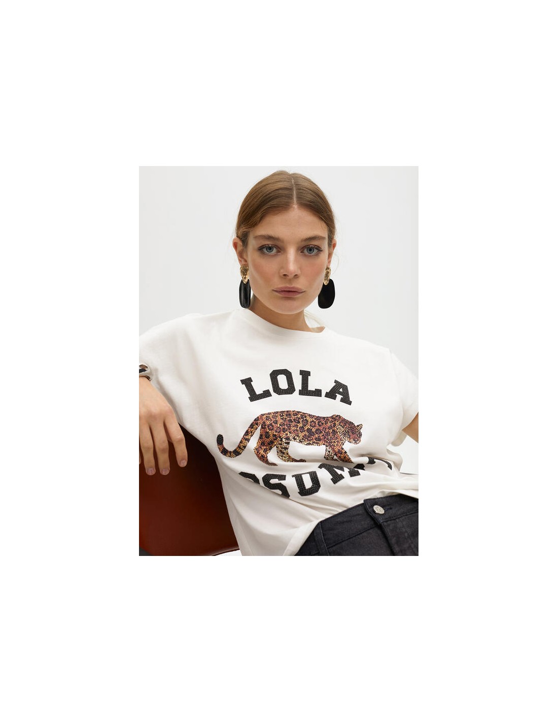 La camiseta blanca de Lola Casademunt es mucho más que un básico. Su diseño frontal con tigre estampado en tonos animal print y las letras decorativas le dan un aire deportivo y actual. Perfecta para quienes buscan una prenda cómoda con un punto diferenciador.