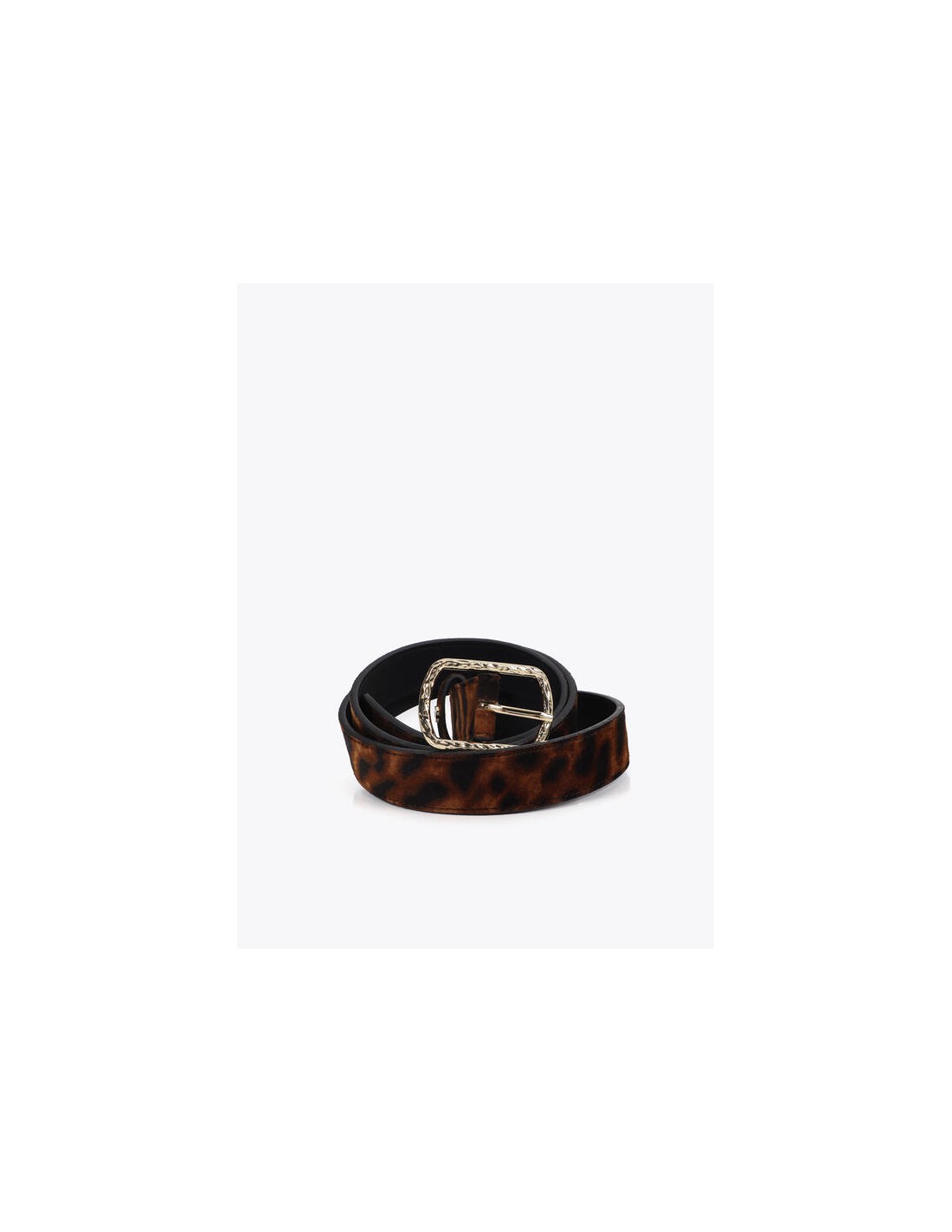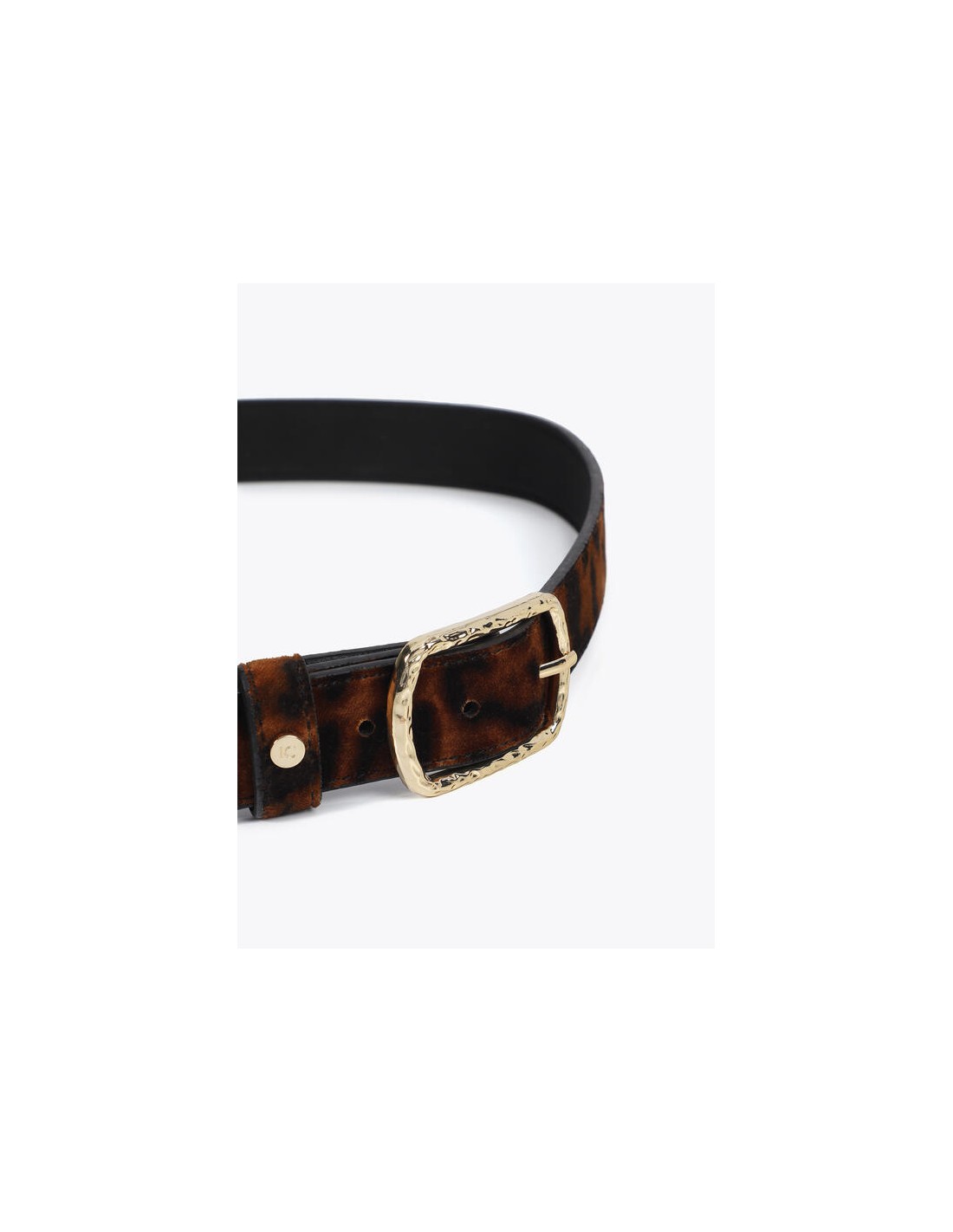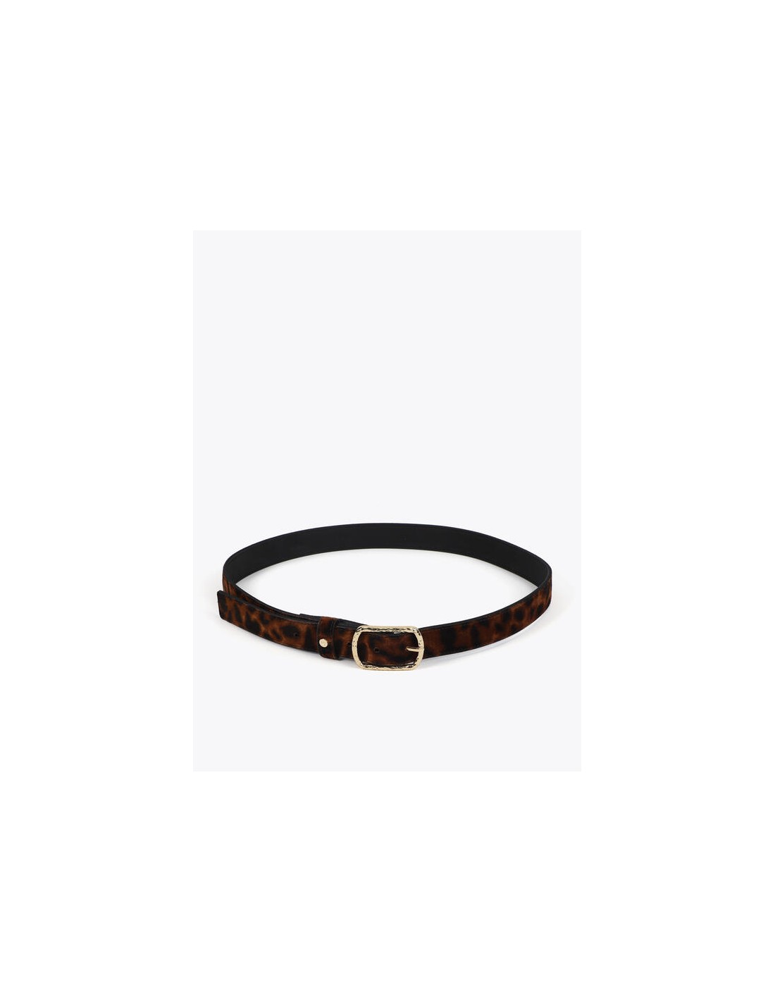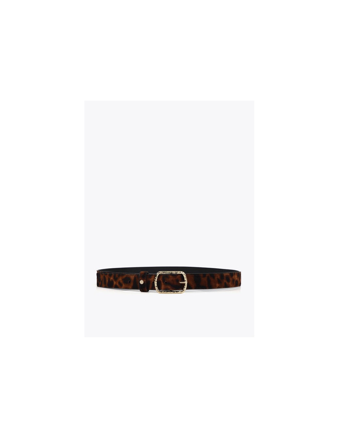 Cinturón estrecho de Lola Casademunt con estampado animal print en tonos marrón y negro. Su hebilla metálica dorada martillada lo convierte en el accesorio ideal para añadir un toque sofisticado y actual a cualquier look.