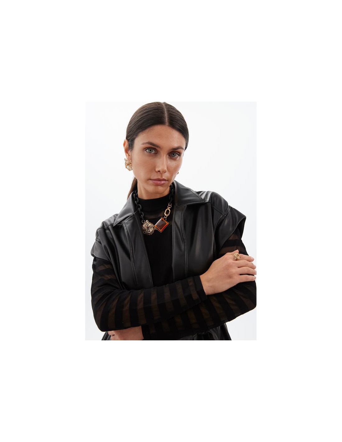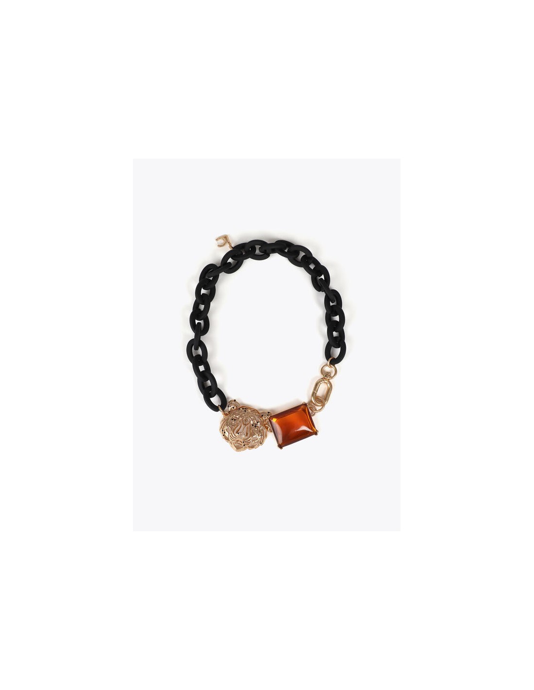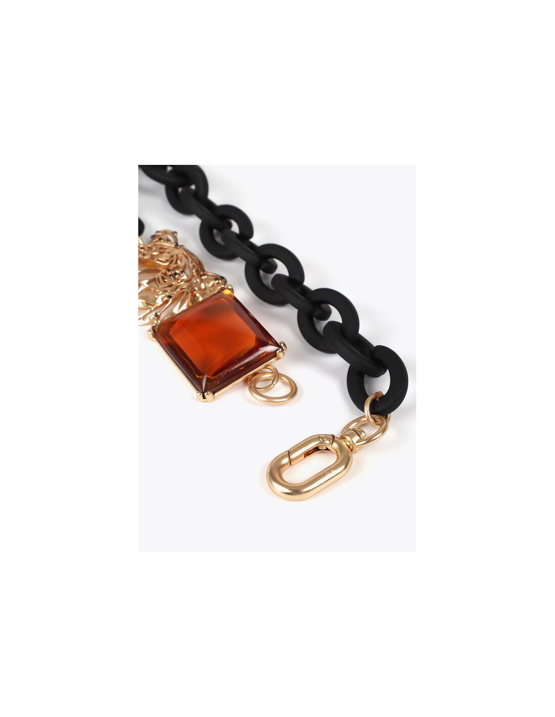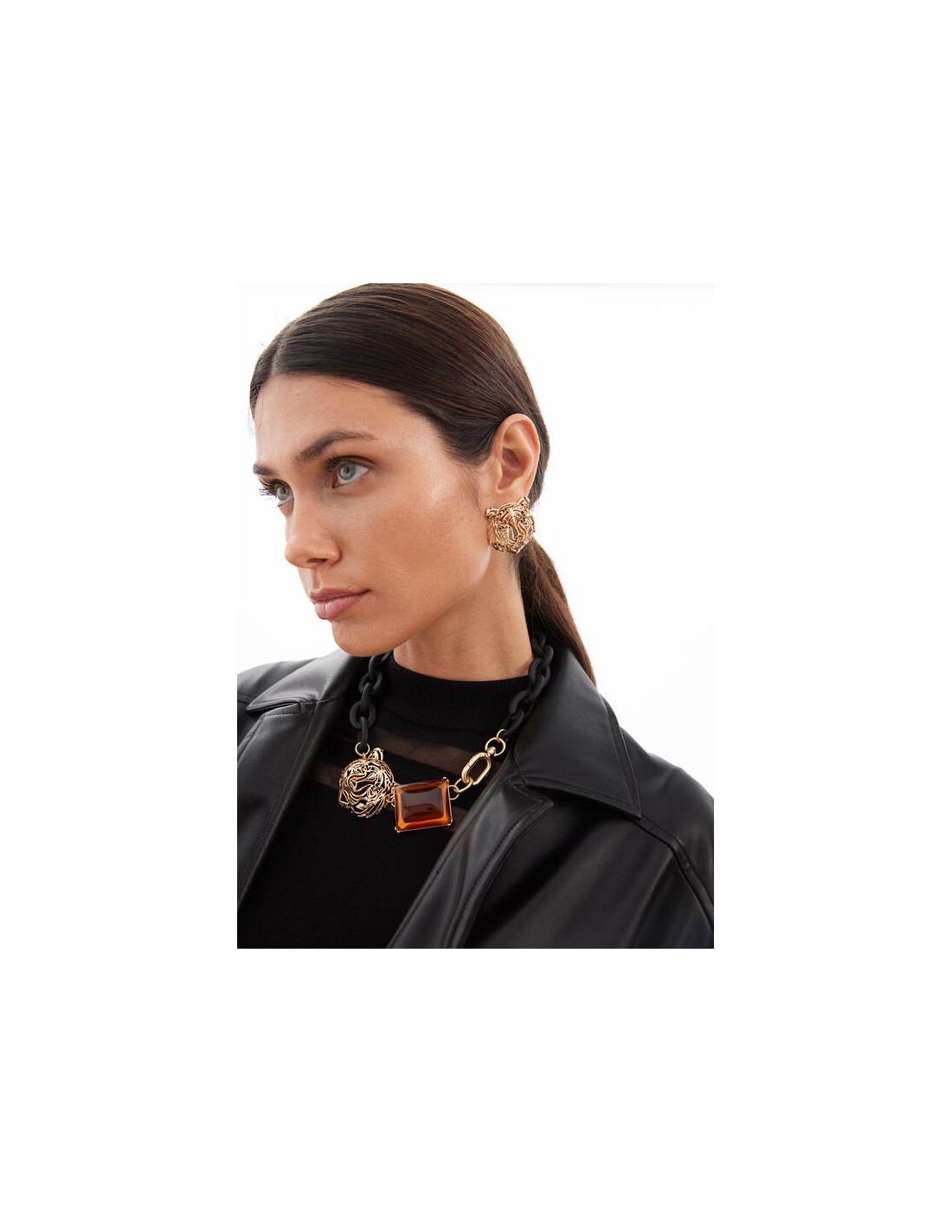 Este collar corto de Lola Casademunt es una pieza de impacto que une fuerza y sofisticación. Presenta una cadena engomada negra de eslabones gruesos que aporta presencia, combinada con un colgante metálico dorado en forma de tigre calado y una piedra acrílica en tono ámbar con efecto cristal.