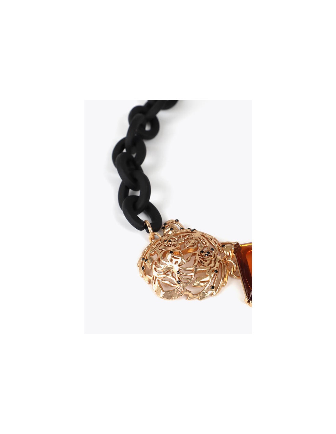 Collar Corto Lola Casademunt con Cadena Negra, Tigre Dorado y Cristal Ámbar