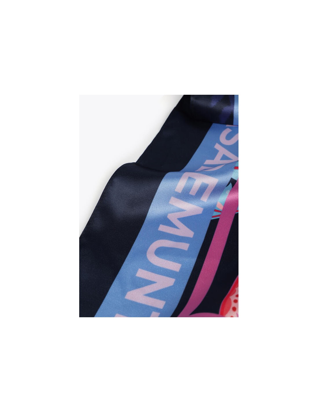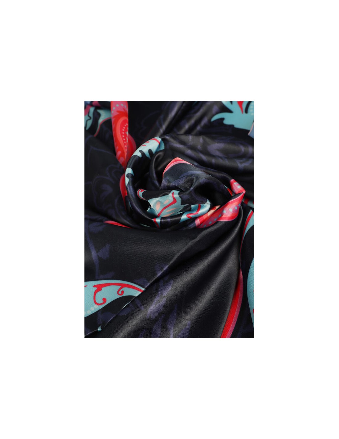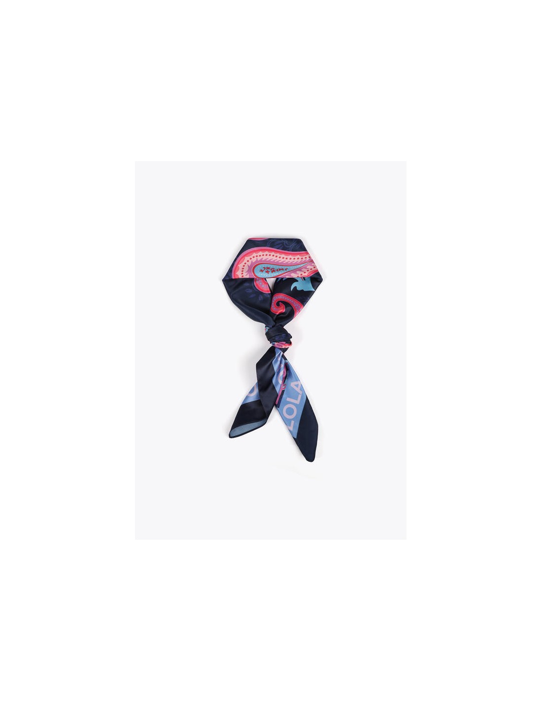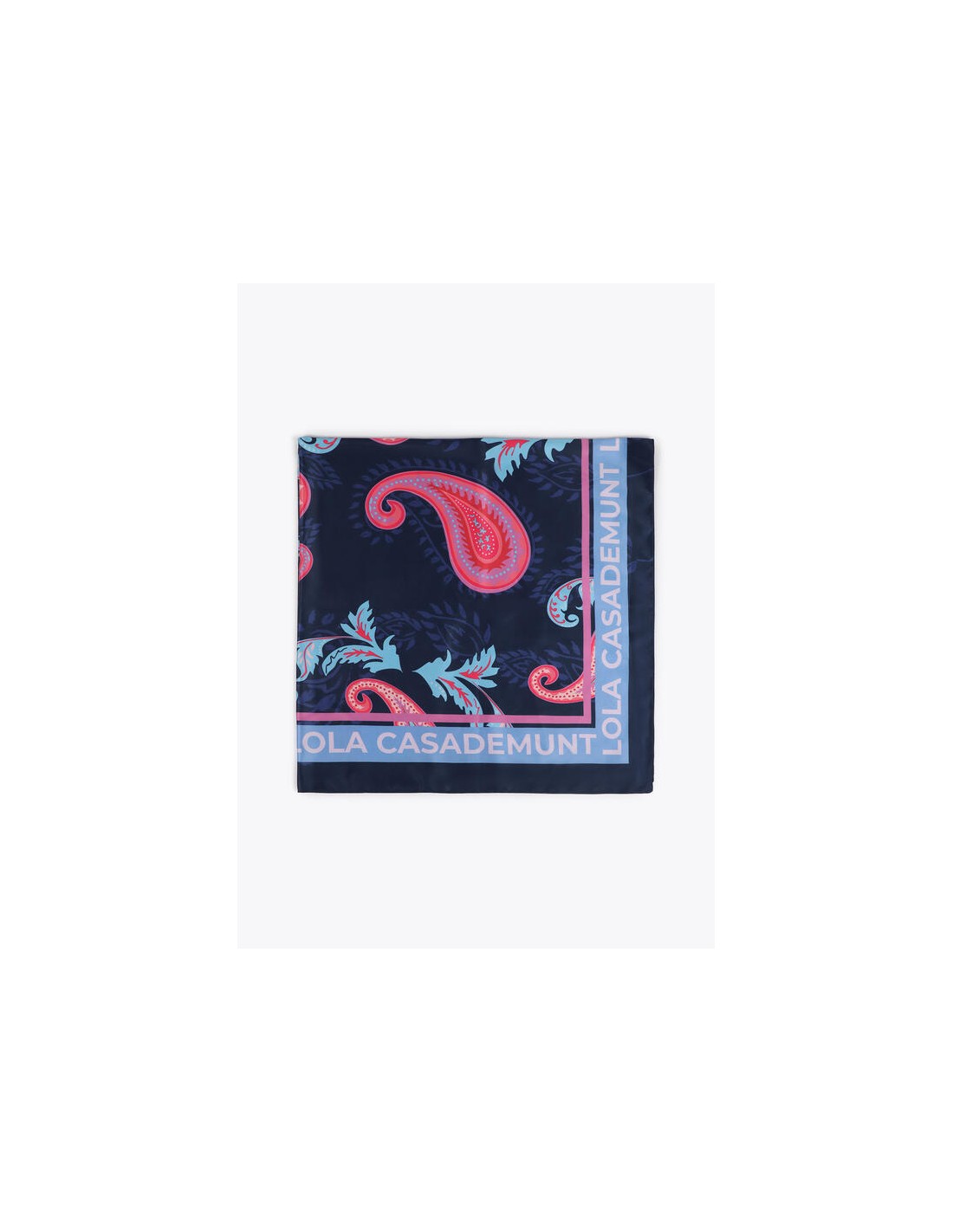 Pañuelo satinado azul marino con estampado paisley en tonos coral y turquesa. Una pieza versátil y sofisticada de Lola Casademunt, 100% poliéster.