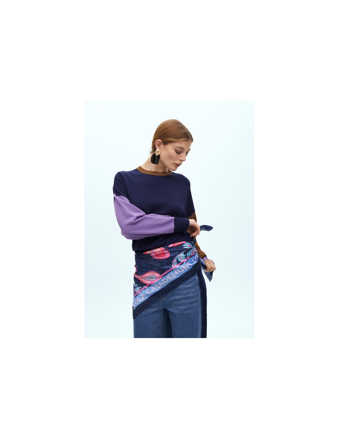 Este pañuelo estampado paisley de Lola Casademunt aporta color, elegancia y un aire bohemio chic a tu look. Su base azul marino se combina con paisleys en tonos coral, fucsia y turquesa, logrando un contraste vibrante y actual. El borde con el logotipo de la marca enmarca el diseño con un acabado sofisticado.