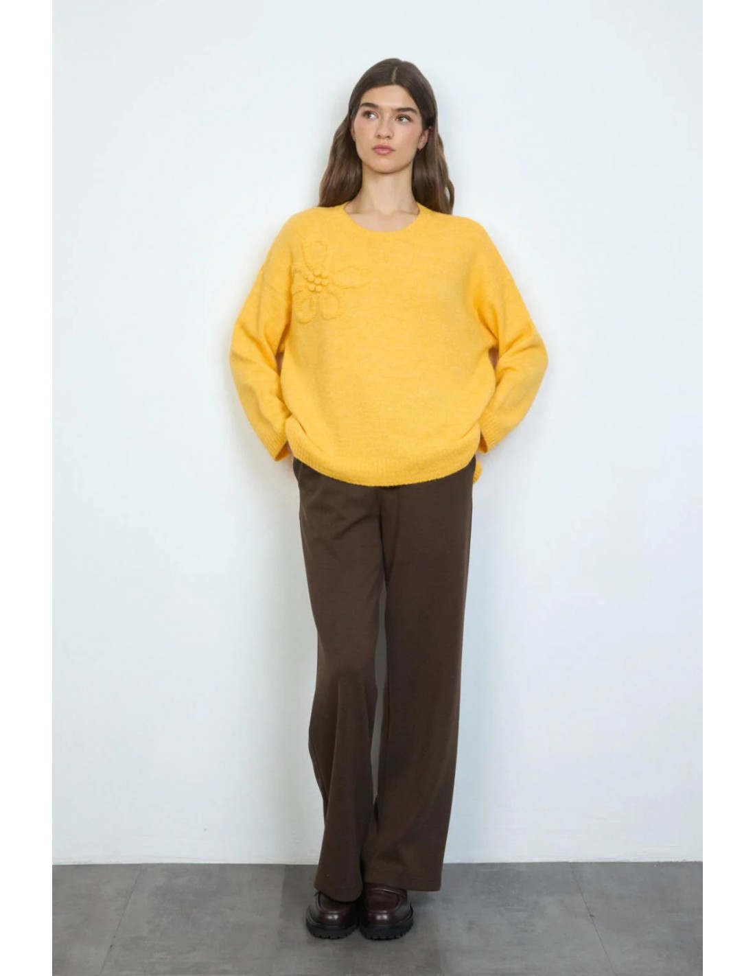 El jersey "Barbara" de Tinta & Bariloche es una prenda que aporta color y personalidad. Su tono amarillo vibrante ilumina cualquier conjunto, mientras que el bordado floral en relieve en el lateral del pecho le da un aire original y femenino.
