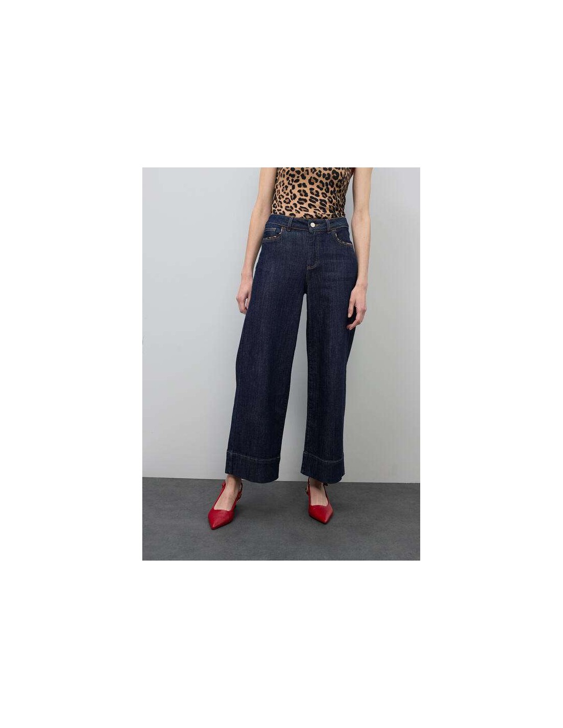 Confeccionado en denim azul oscuro, destaca por su corte culotte de pernera ancha y largo tobillero, que aporta una silueta moderna y favorecedora.