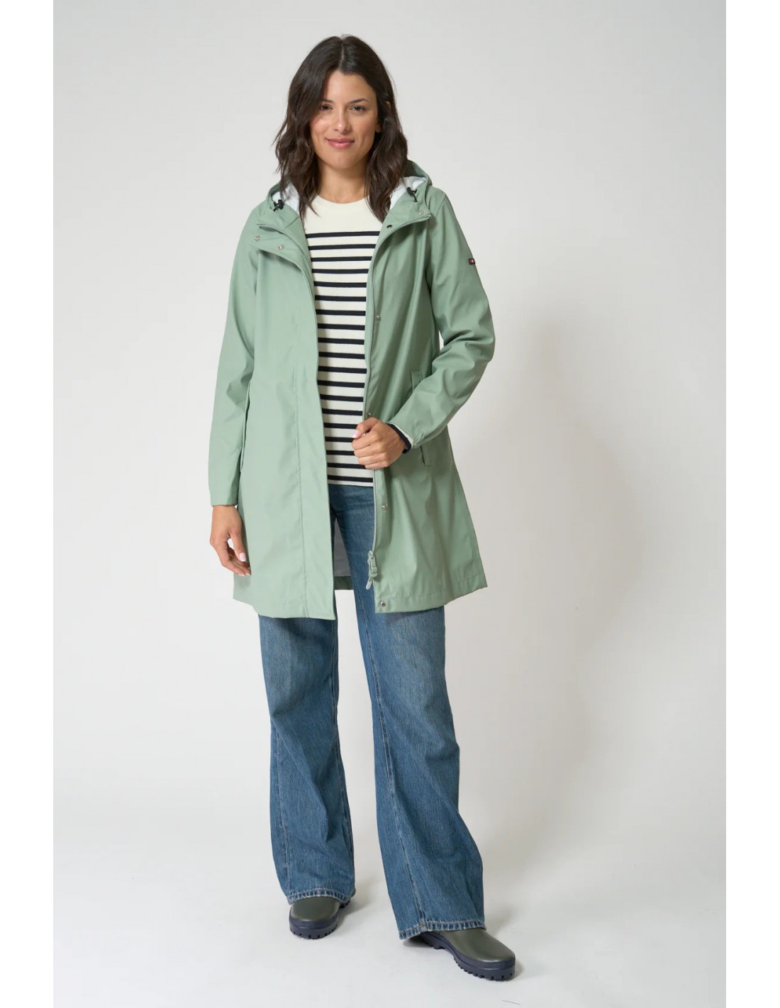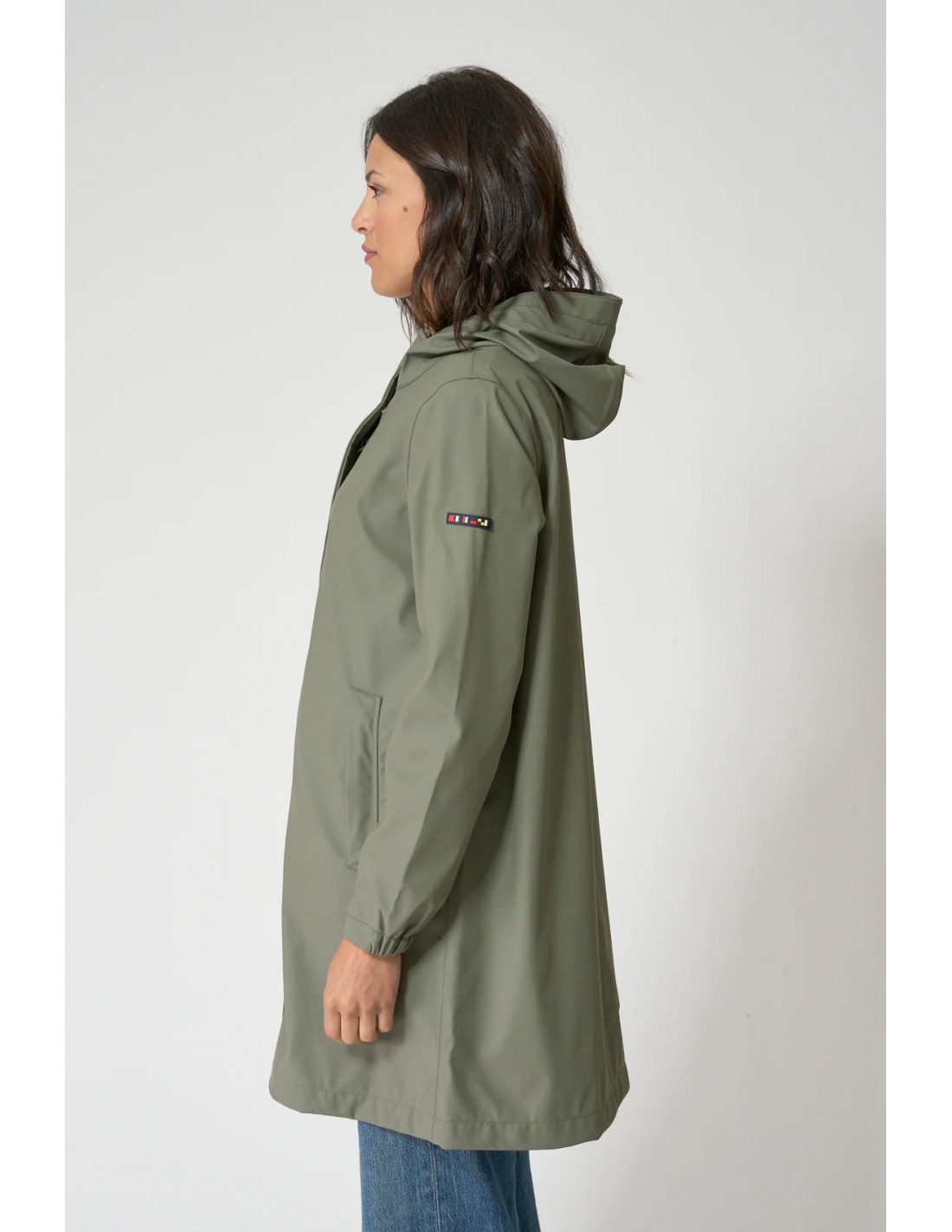 Chubasquero impermeable de Batela para mujer, disponible en verde MUBA o verde CLINIC. Con resistencia al agua de 5000 mm, costuras selladas y capucha ajustable, garantiza protección total frente a la lluvia. Diseño ligero y funcional con corte en forma de A y detalles marineros que aportan estilo. Perfecto para el día a día o escapadas al aire libre.