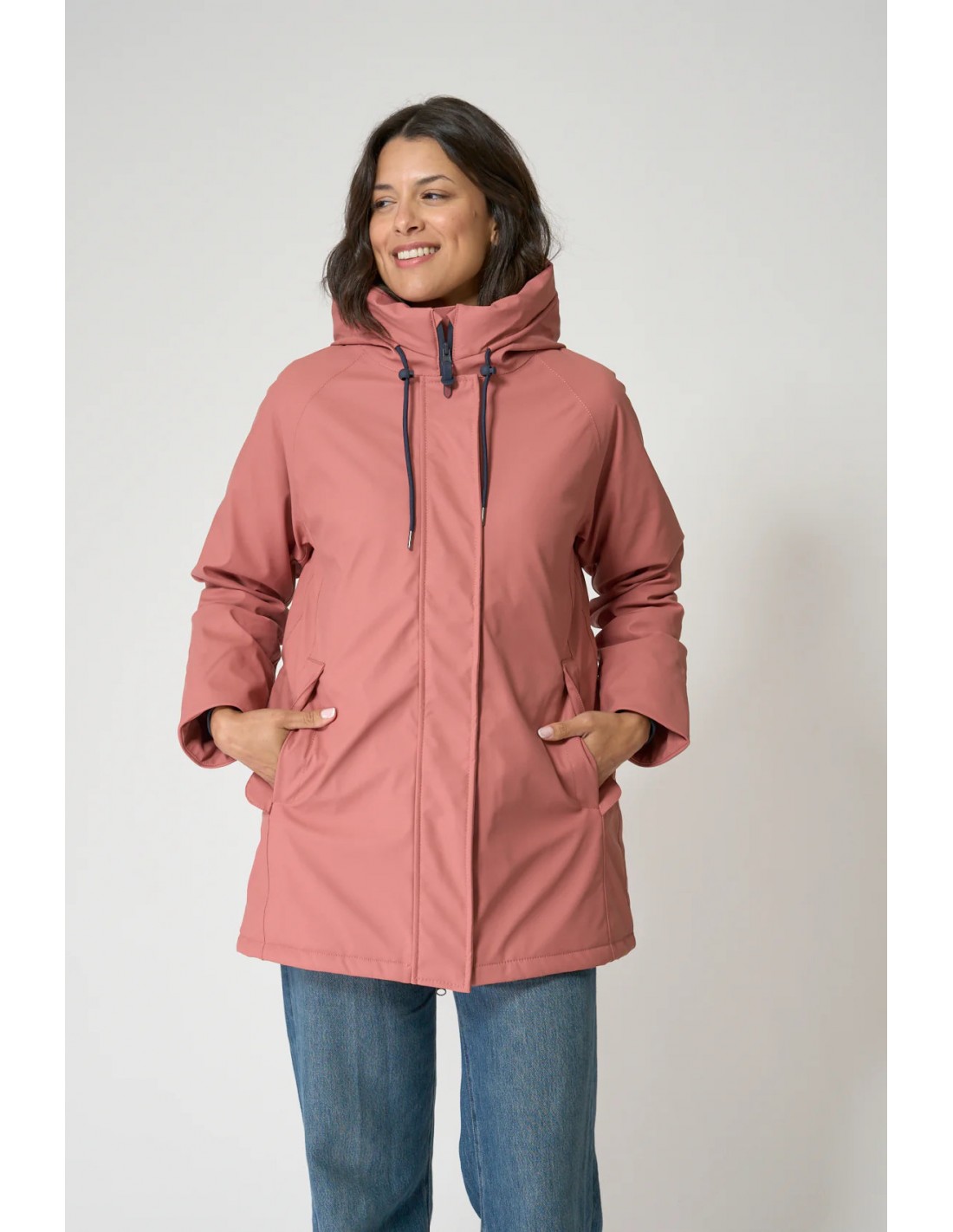 El chubasquero de mujer Batela ofrece un diseño impermeable de alto rendimiento (5000 mm) gracias a su tejido técnico y costuras selladas. Perfecto para los días de lluvia, combina practicidad con un toque moderno y femenino.