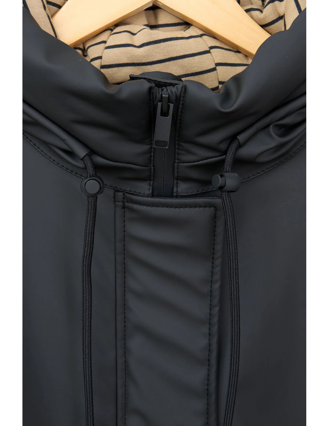 Chubasquero Batela impermeable para mujer con acolchado ligero y forro interior de algodón a rayas. Diseñado para máxima protección contra la lluvia (5000 mm), con costuras selladas, capucha ajustable y puños cortavientos. Su corte A con mangas raglán ofrece comodidad y estilo para el día a día. Disponible en negro y rosa.