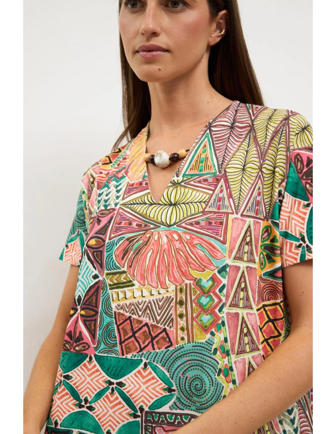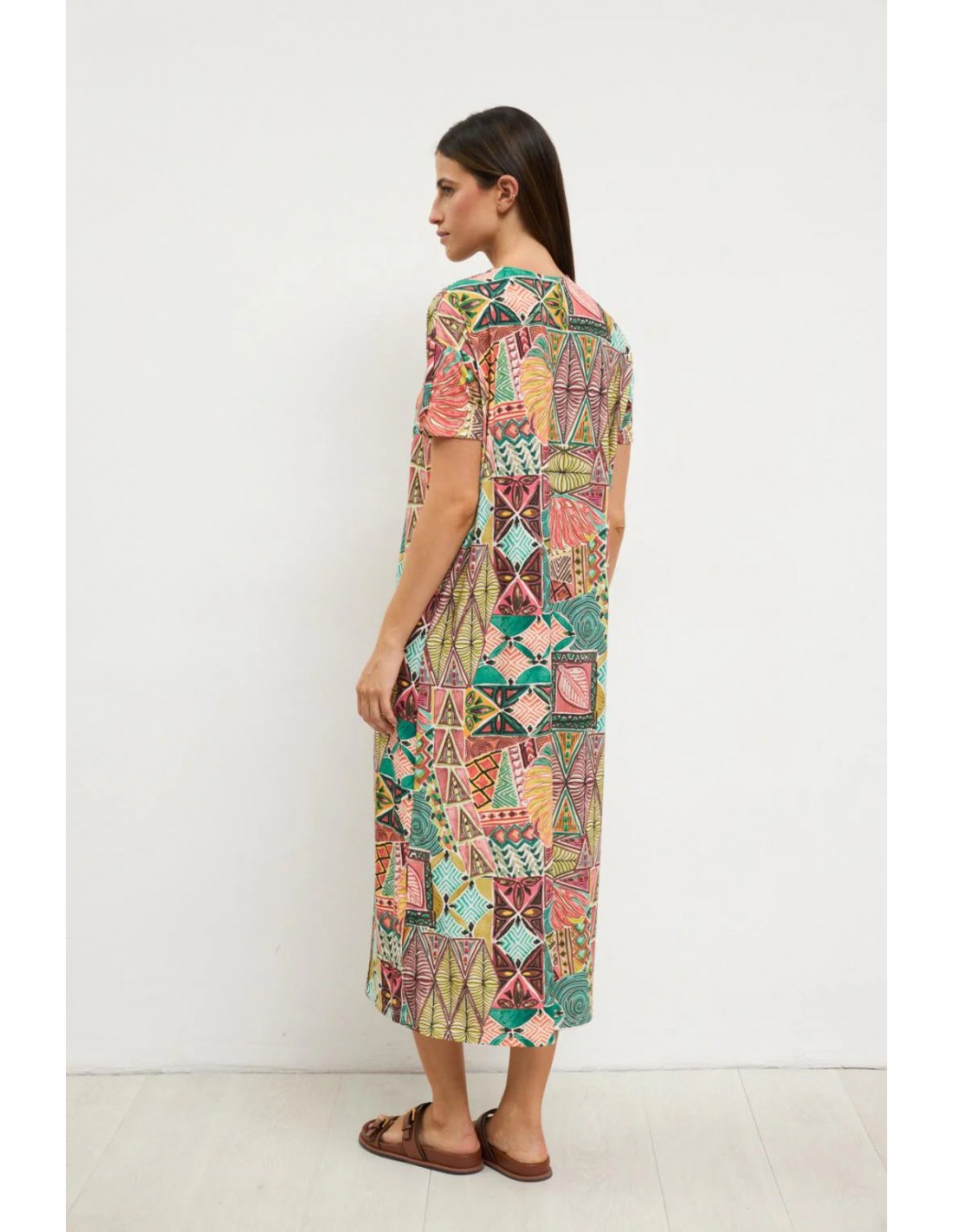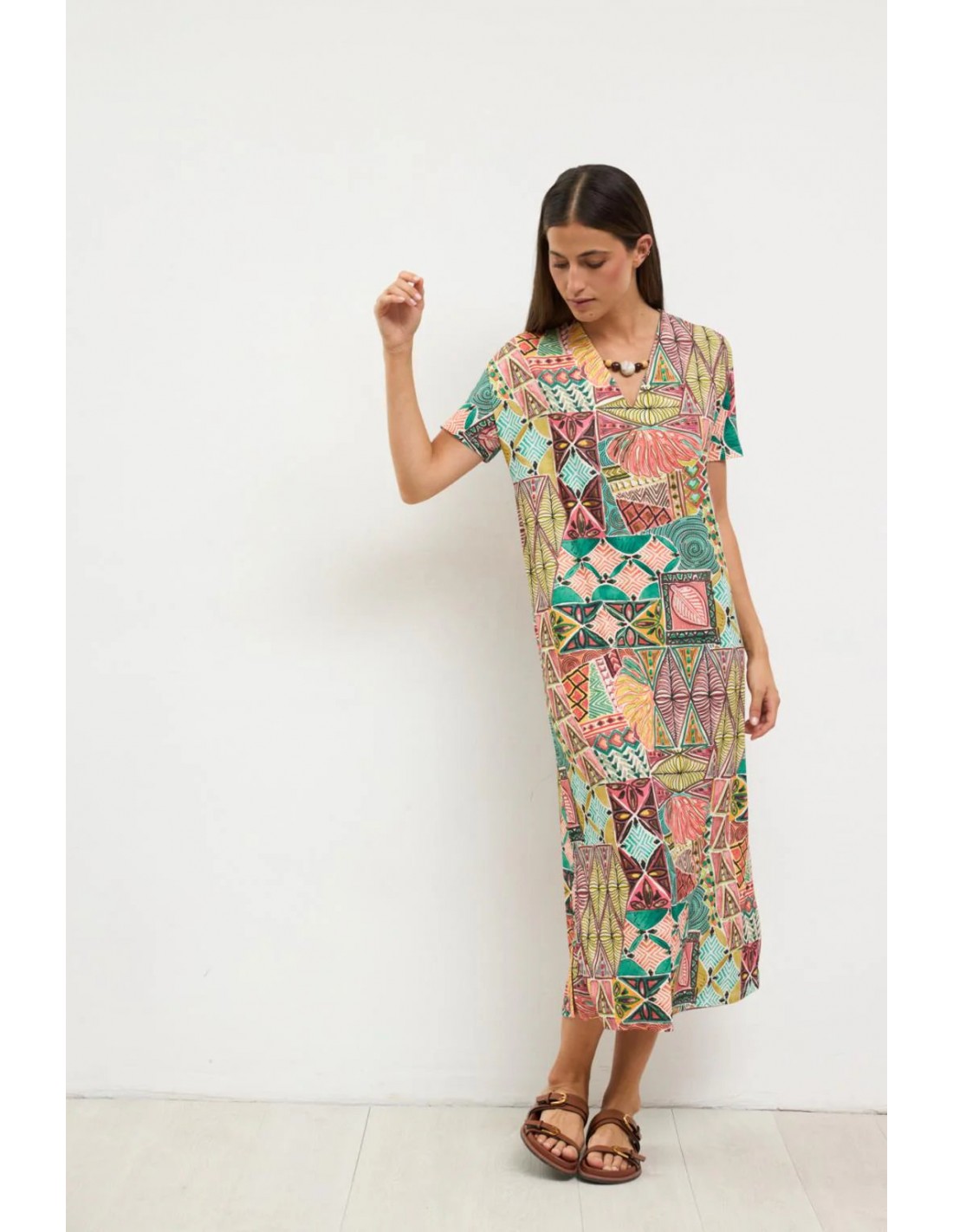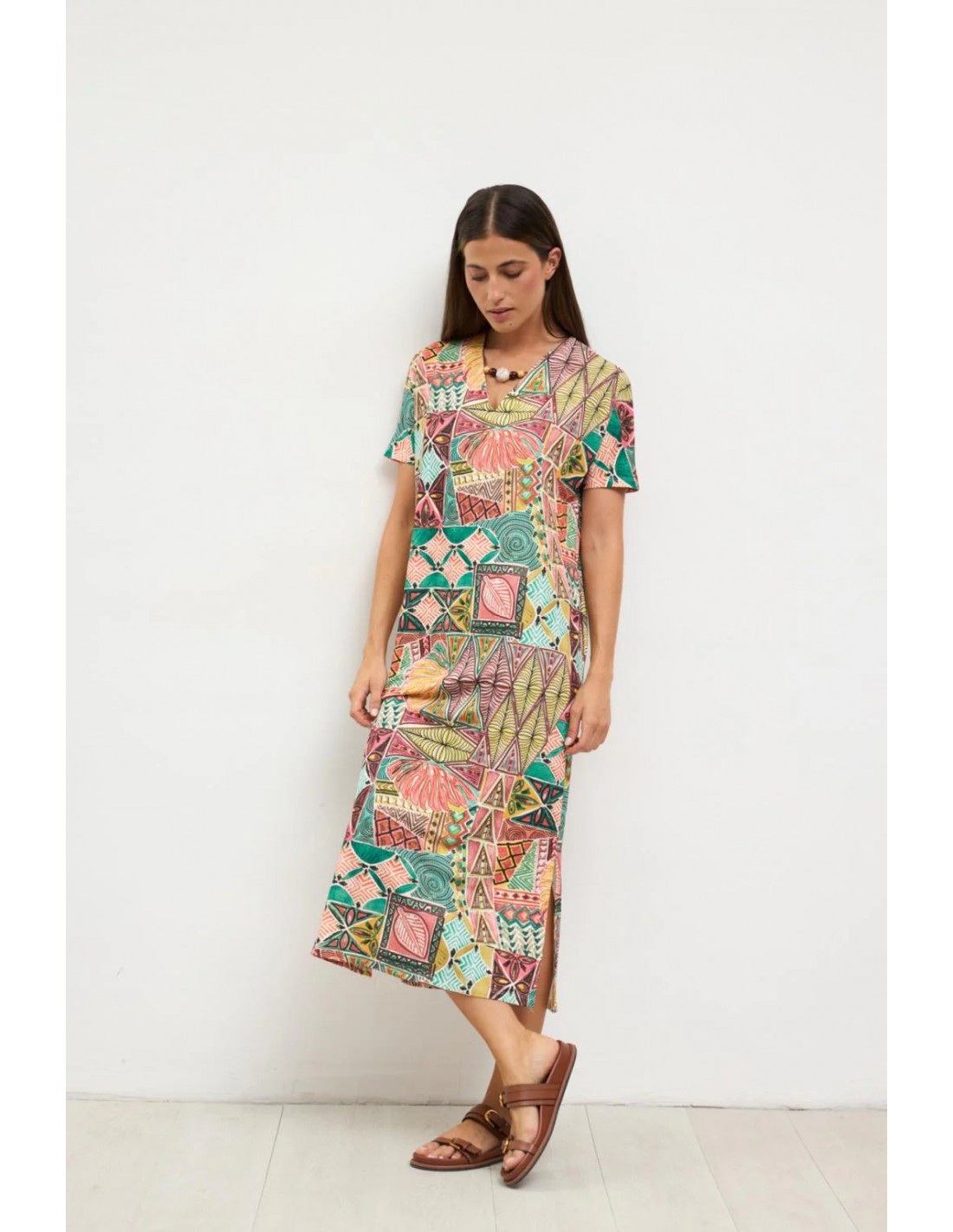 El vestido Haizea de Tinta y Bariloche es una prenda perfecta para quienes buscan comodidad y personalidad en un solo look. Su estampado multicolor de inspiración geométrica y artística, sobre una base en tonos cálidos, aporta un acabado muy especial y lleno de carácter.